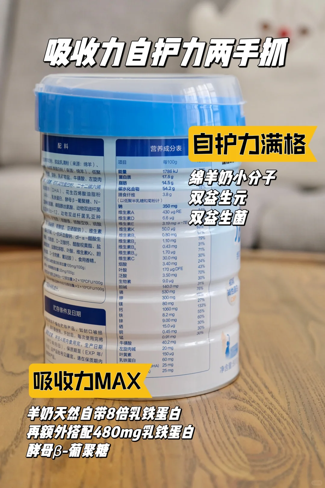 加上小朋友的自我保护力其实还没有完善,它一罐还有480mg乳铁蛋白+羊奶天然8倍乳铁蛋白+酵母β葡聚糖,提升孩子自护力,抵御各种流行期🦠的侵害,现在哥俩请假次数都少了✌🏻