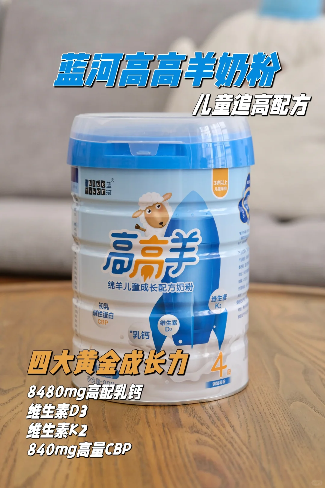 我家去年开始喝的蓝河高高羊奶粉,它是专门为儿童成长期研制的,8480mg乳钙+维生素D3+维生素K2+840mgCBP四大黄金成长力配合打组合拳👊🏼