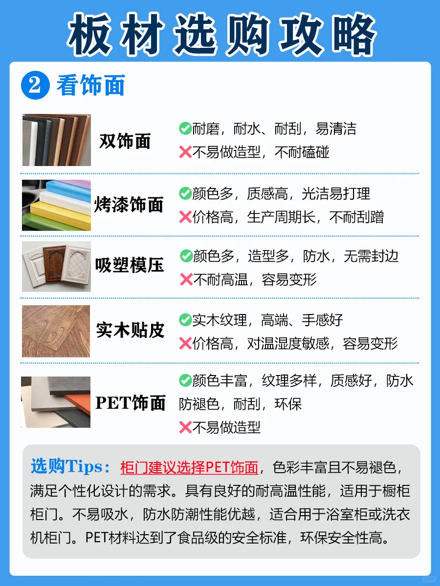 ✅柜体建议选实木多层板,橱柜、浴室柜更防潮耐用,衣柜更不易变形。(见图2)