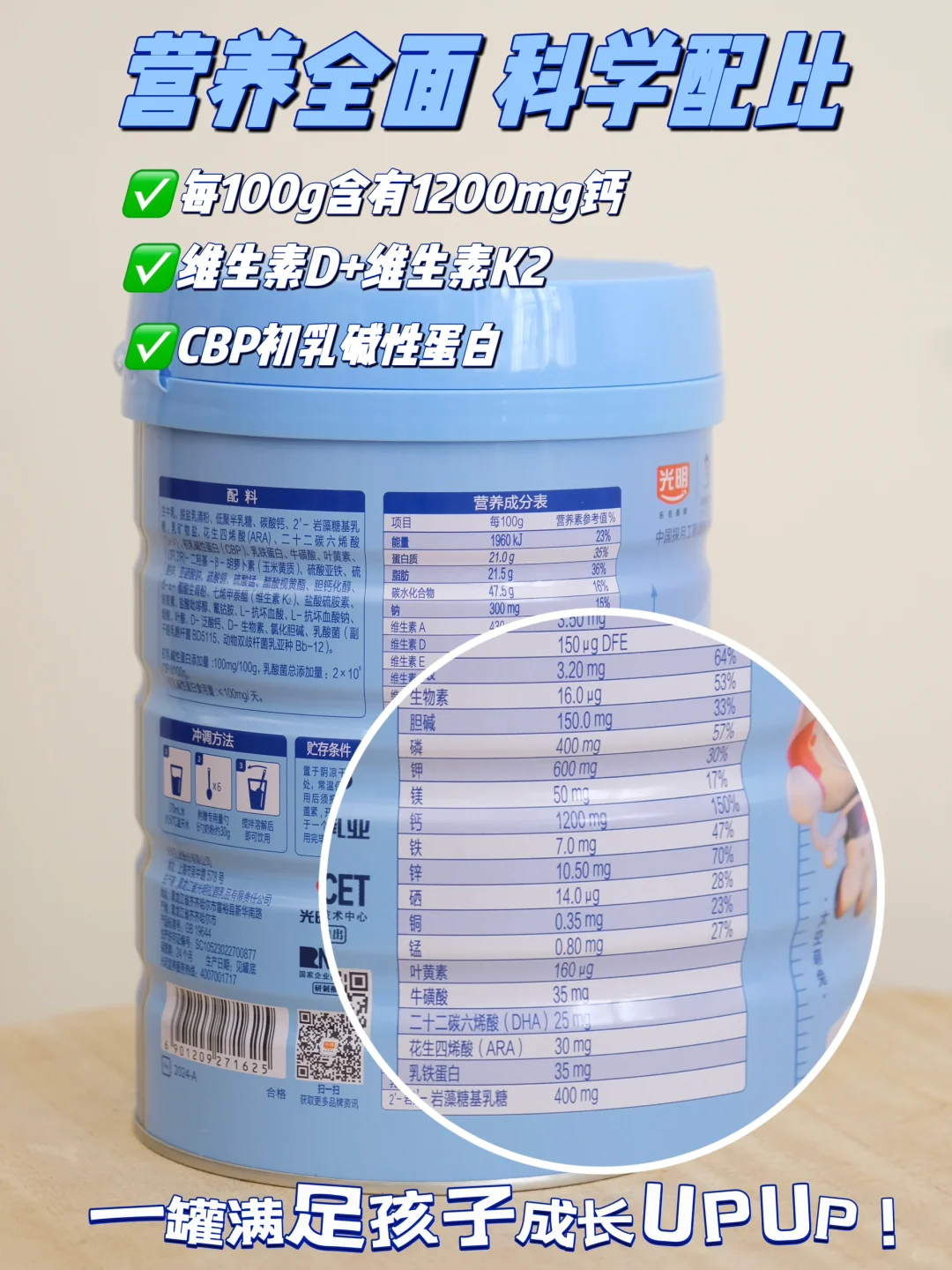 它每100g奶粉中足足含1200mg高钙!要知道成长过程中的孩子,每日推荐摄入800-1200mg的钙质,而2杯光明皓高成长奶粉的钙含量相当于3.4杯普通纯牛奶钙含量!搭配维生素D+维生素K2,能很好的促进骨骼健康,有利于孩子成长UPUPUP❗️