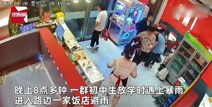 9月20日,河南许昌由于突然下雨,一群初中生无奈跑到路边一家饭店避雨,老板娘见状,贴心拿出纸巾让他们擦干,并让他们打电话回家报平安,听到有同学想冒雨离开,她还拿出一次性雨衣帮他们穿上。