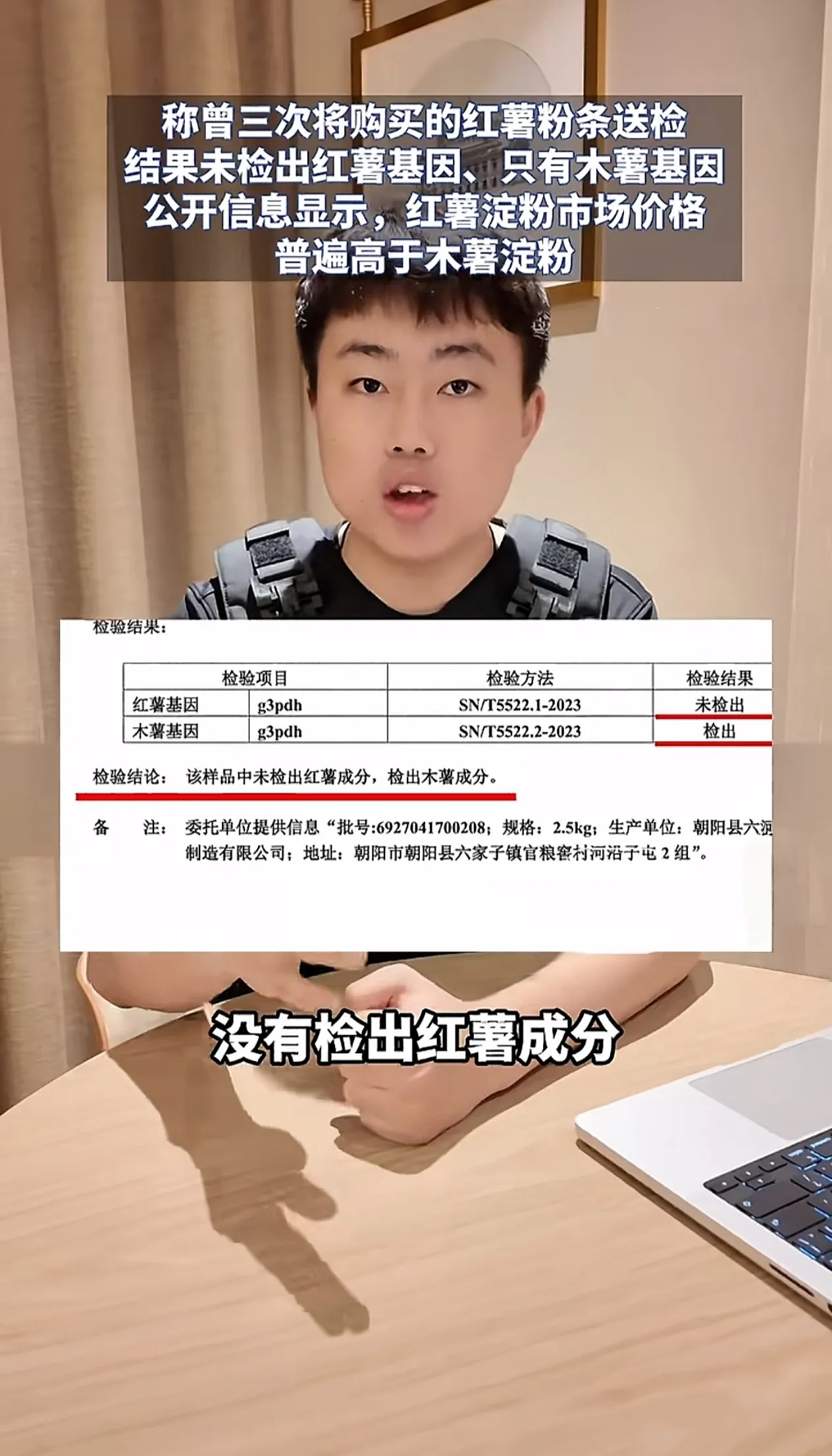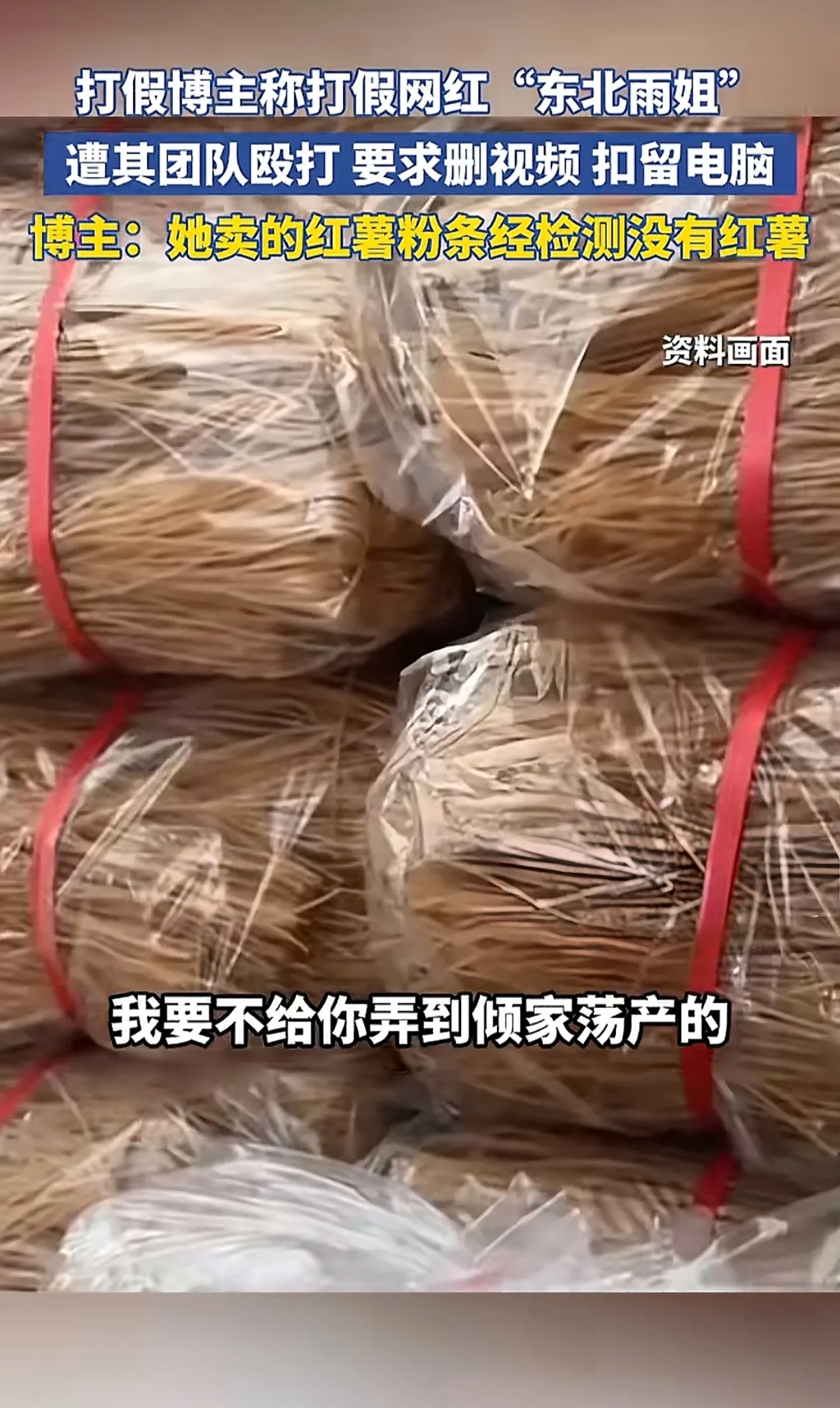 9月23日博主大娃和赏金猎人灰烬,等打假博主,公开爆料东北雨姐直播间,售卖的红薯粉条里,根本没有红薯的成分,据说打假博主两次将红薯,送往海关进行检测,检测结果均显示没有红薯的成分,但是检测出了粉条中有木薯的成分。