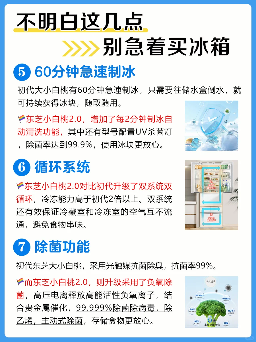东芝小白桃2.0,增加了每2分钟制冰自动清洗功能,有的型号配置UV杀菌灯,除菌率99.9%