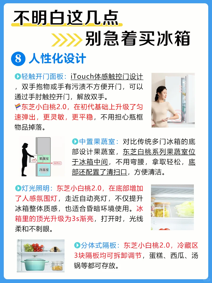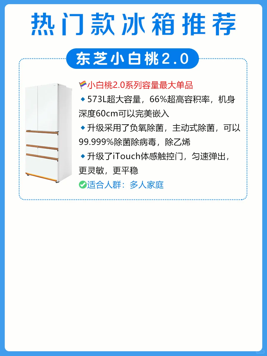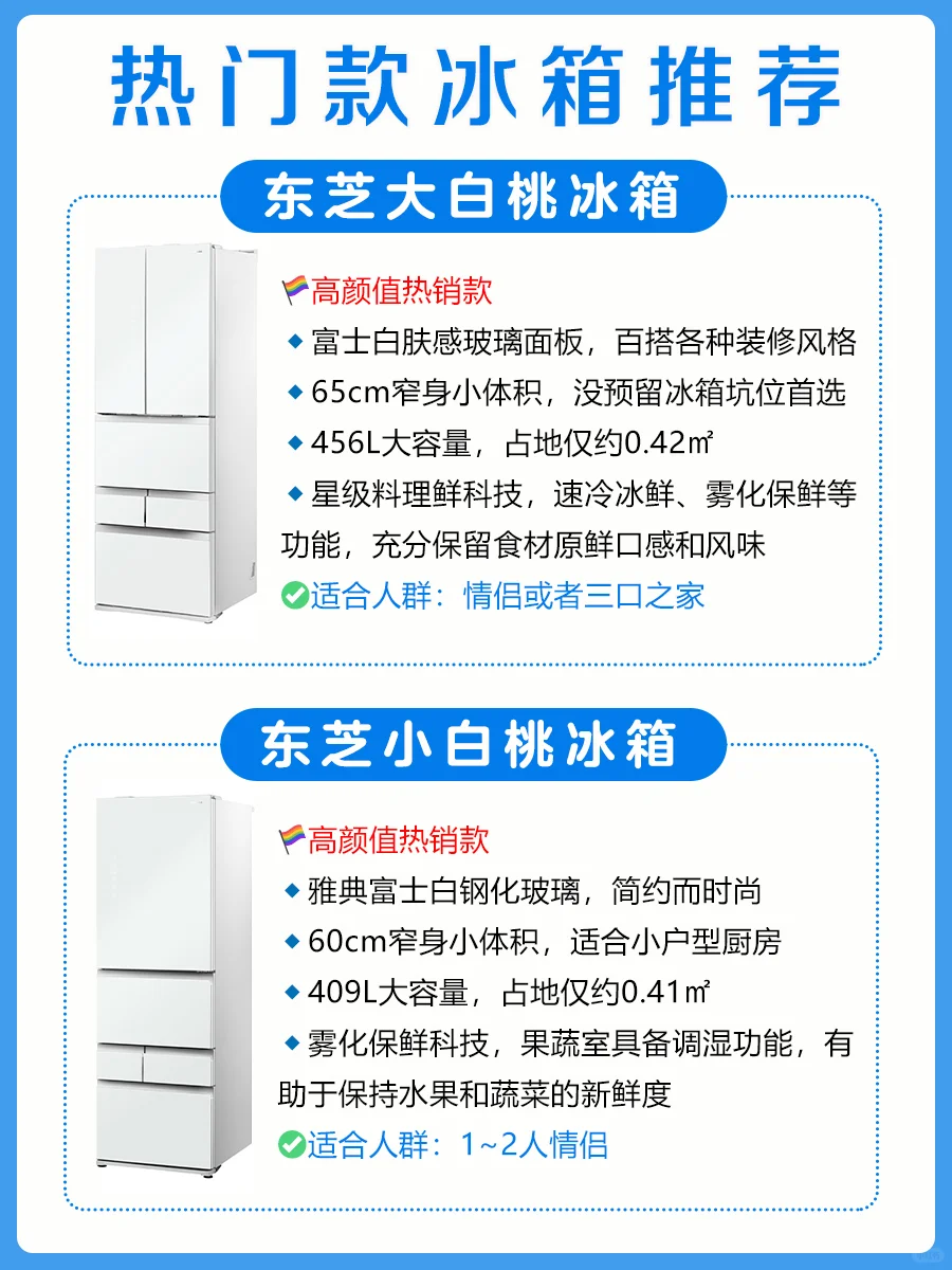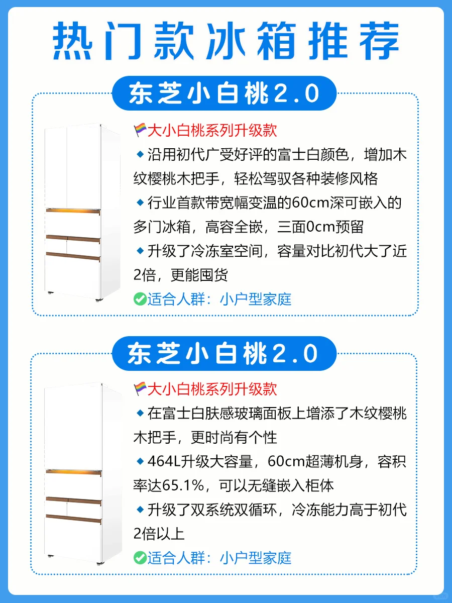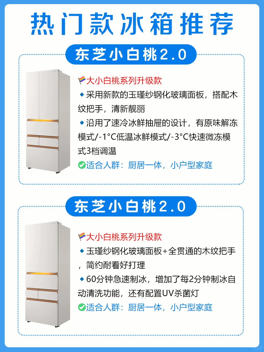✨东芝小白桃2.0在初代大小白桃的基础上做了全面升级,质价比更高,非常值得入手哦!5款产品,在外观、容量等方面略有区别(见图1、8-10),👏🏻好消息:东芝冰箱最近以旧换新,参与国补最高可省2000块!