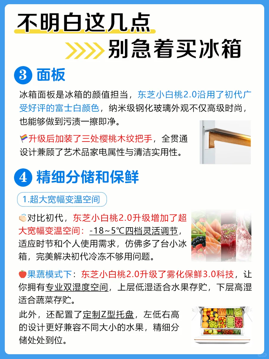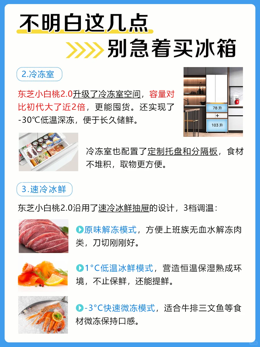 东芝小白桃2.0沿用速冷冰鲜抽屉,原味解冻模式、-1°C低温冰鲜模式、;-3°C快速微冻模式3档调温