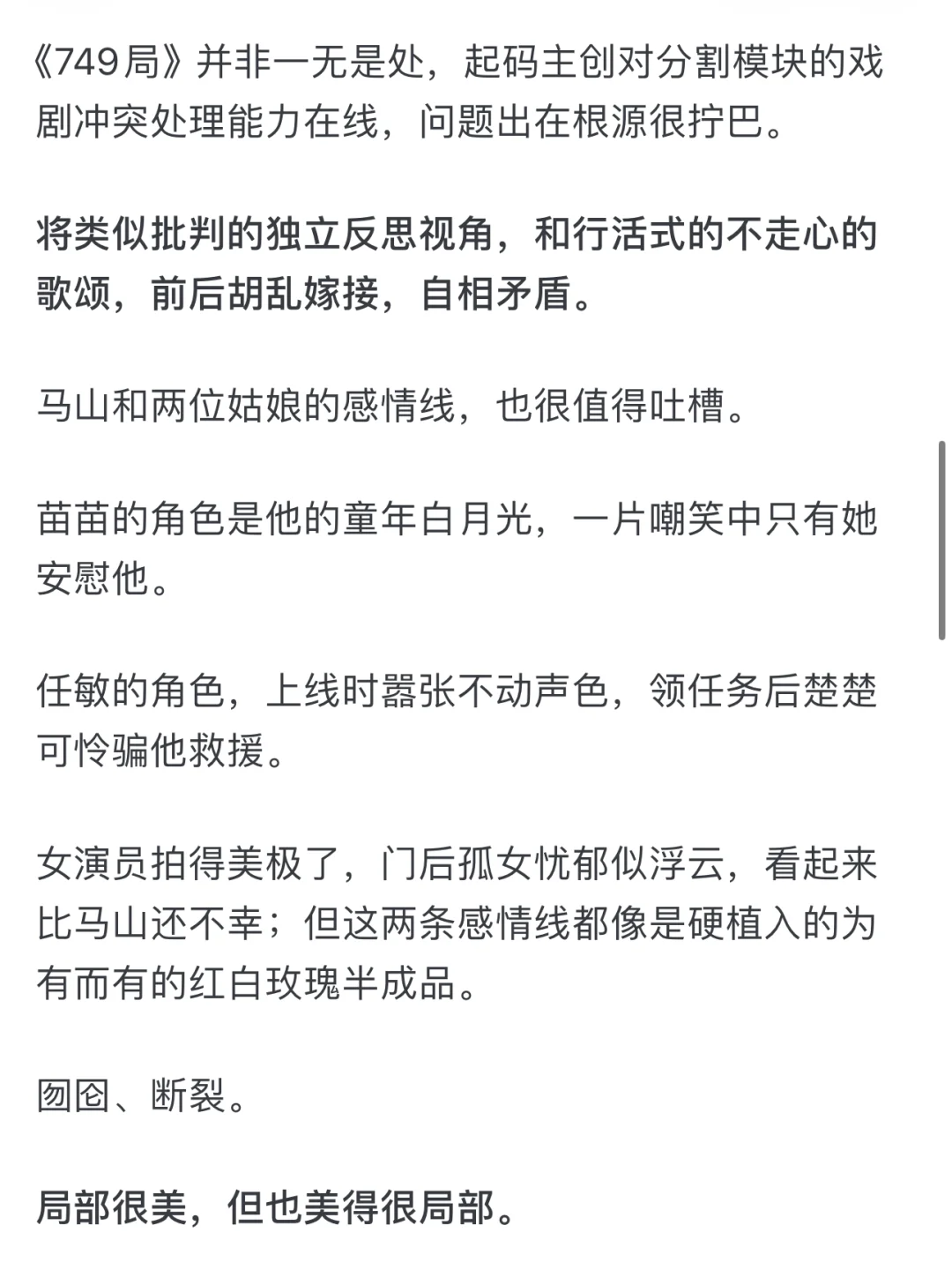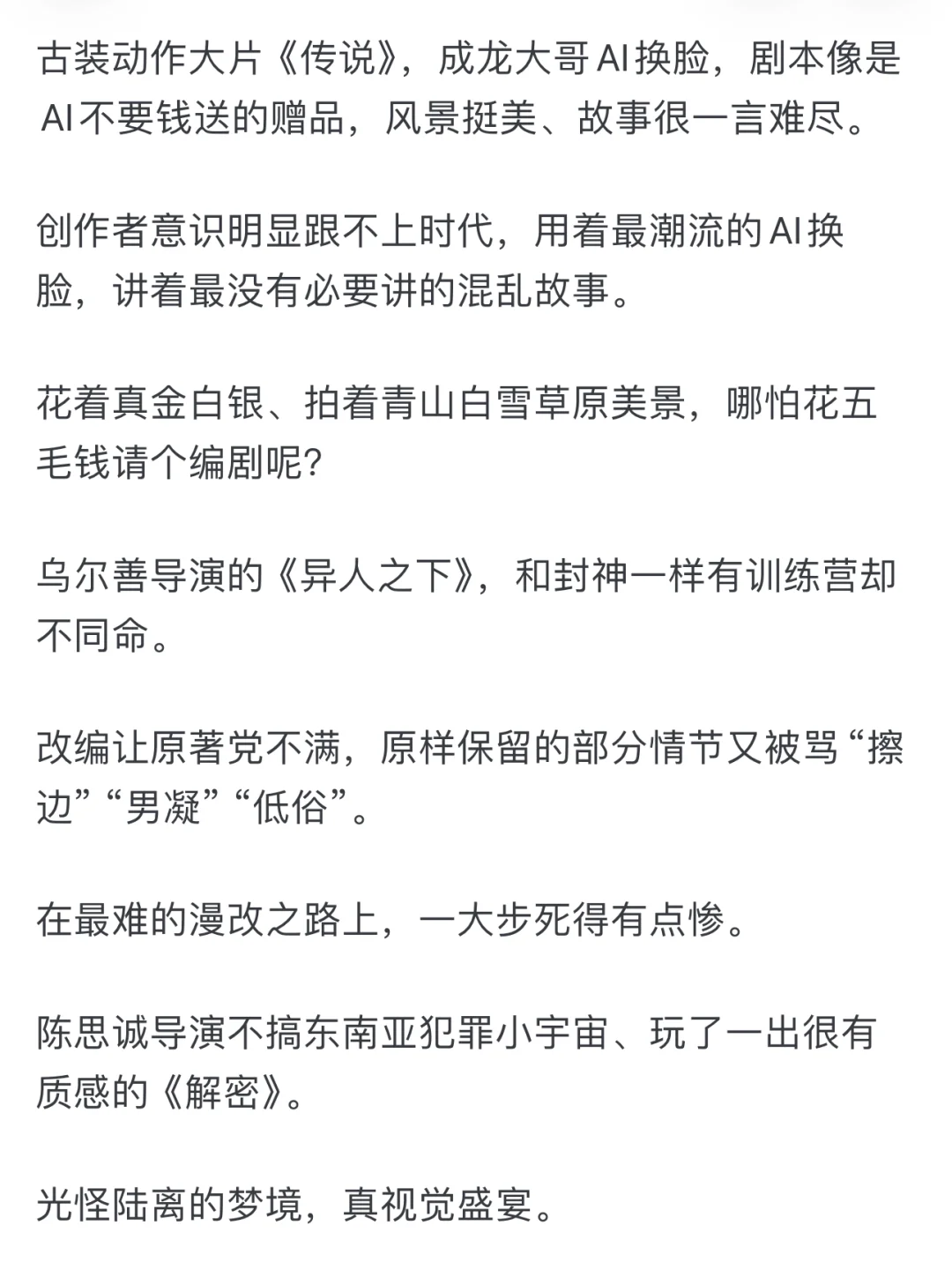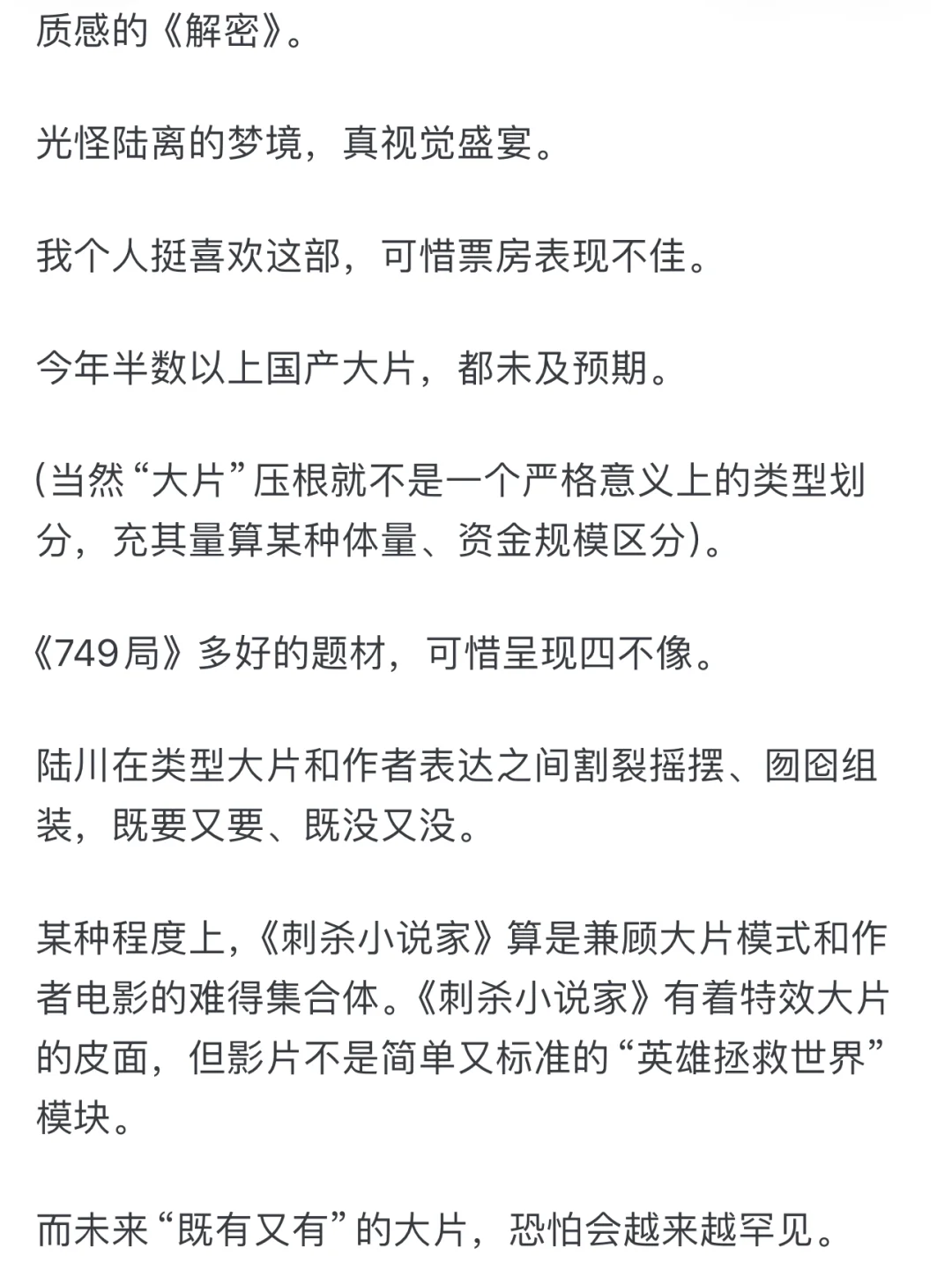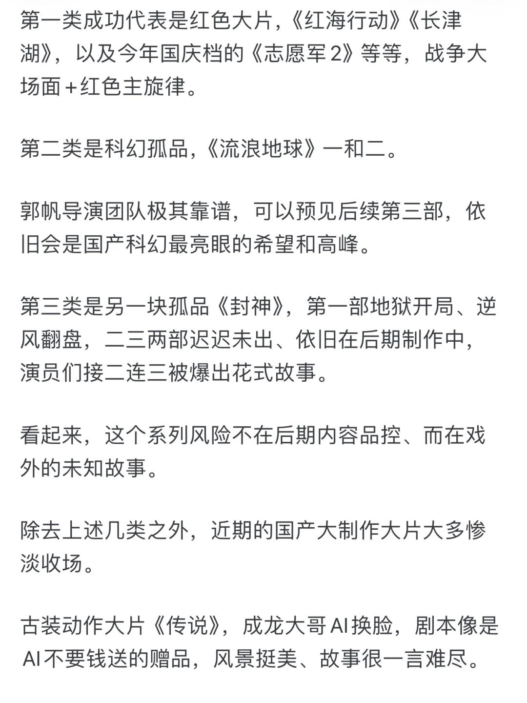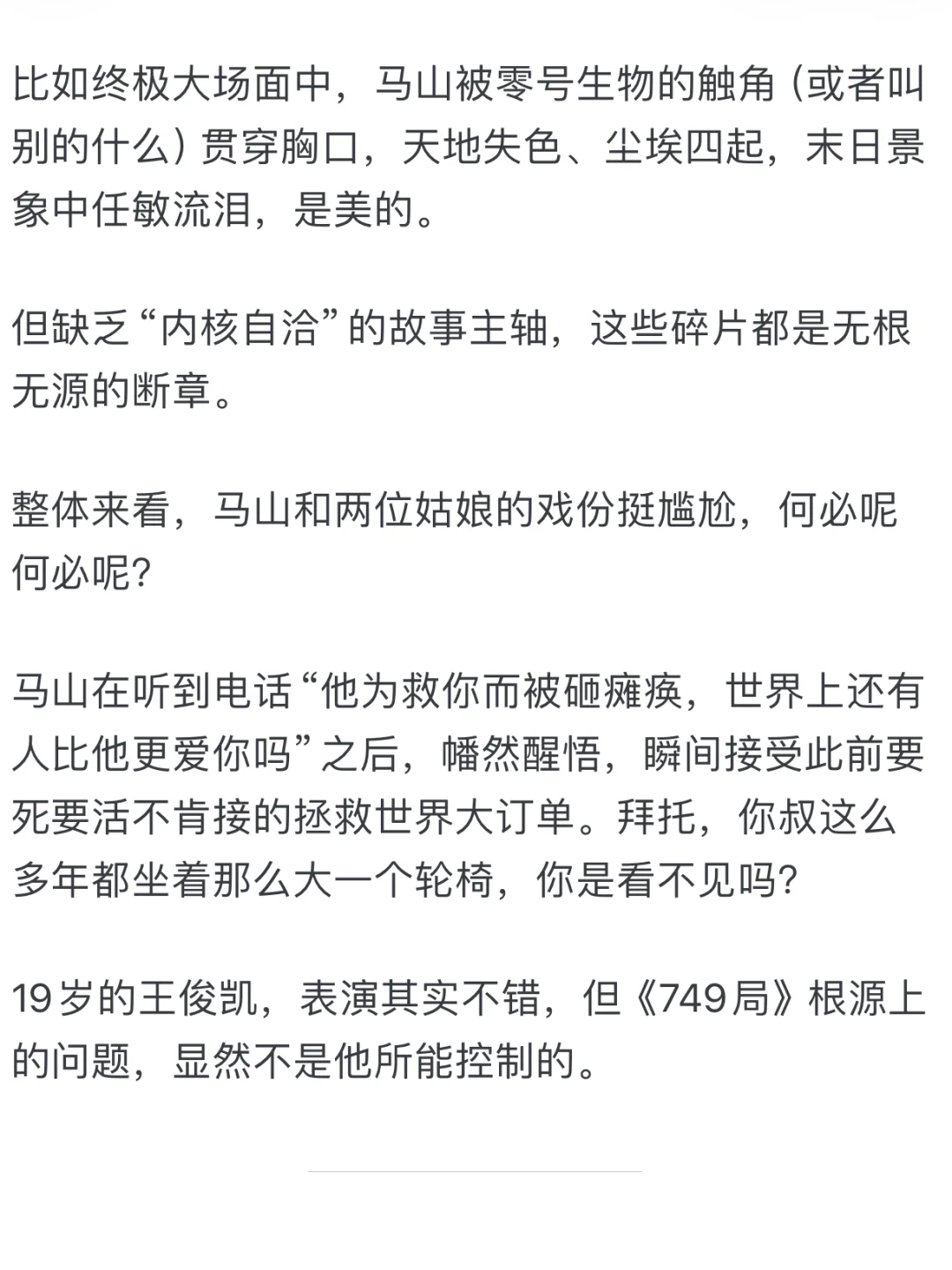 你看,导演一方面妥协于商业大片的架构需求,一方面囫囵转向主旋律式的英勇高光,内外不匹、心口不一,不甘不愿不畅快,前后不伦不类