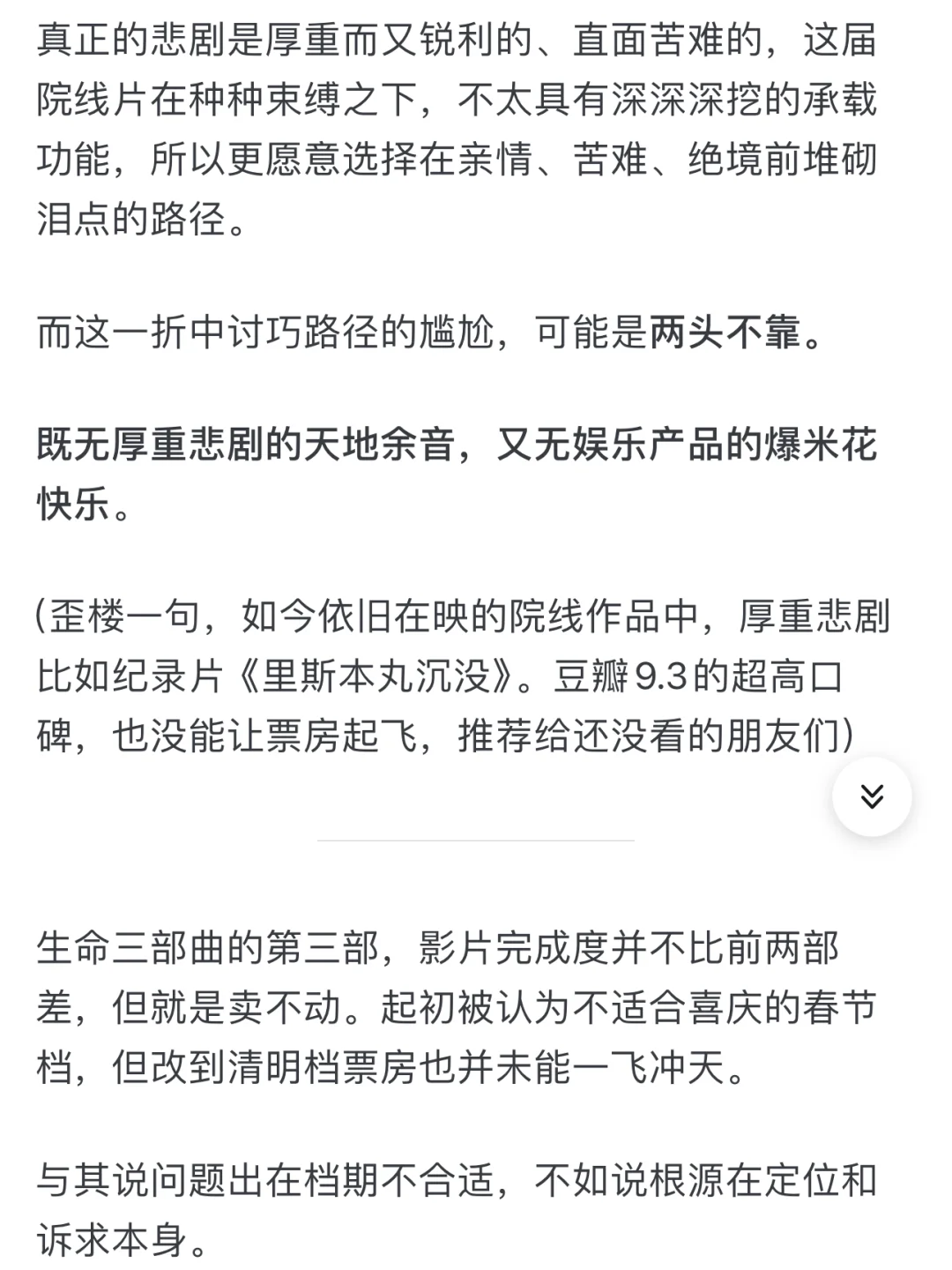 真正的悲剧是厚重而又锐利的、直面苦难的,这届院线片在种种束缚之下,不太具有深深深挖的承载功能,所以更愿意选择在亲情、苦难、绝境前堆砌泪点的路径