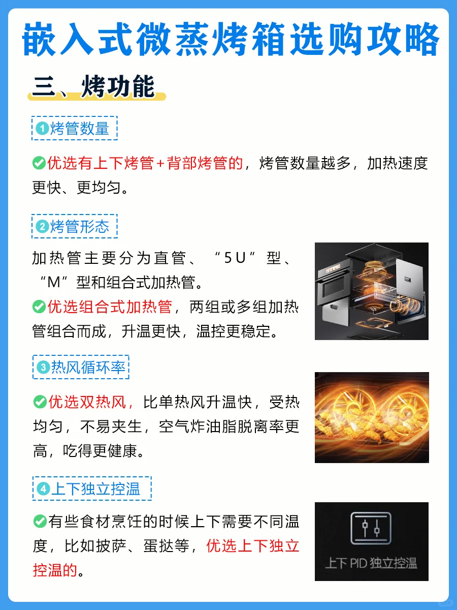✅选有上下烤管+背部烤管的,烤管数量越多,加热速度更快、更均匀。