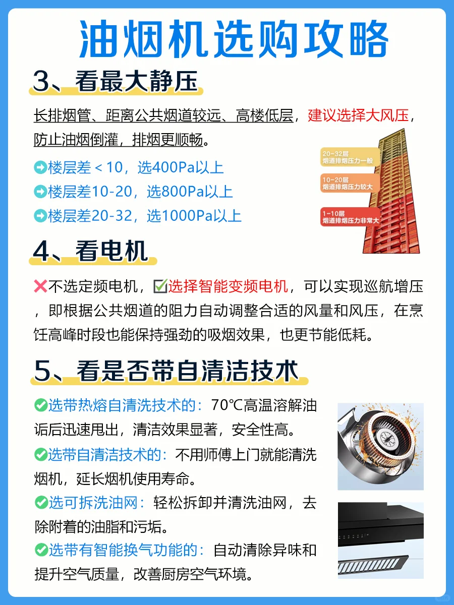 ✅长排烟管、距离公共烟道较远、高楼低层,选大风压,防止油烟倒灌,排烟更顺畅。