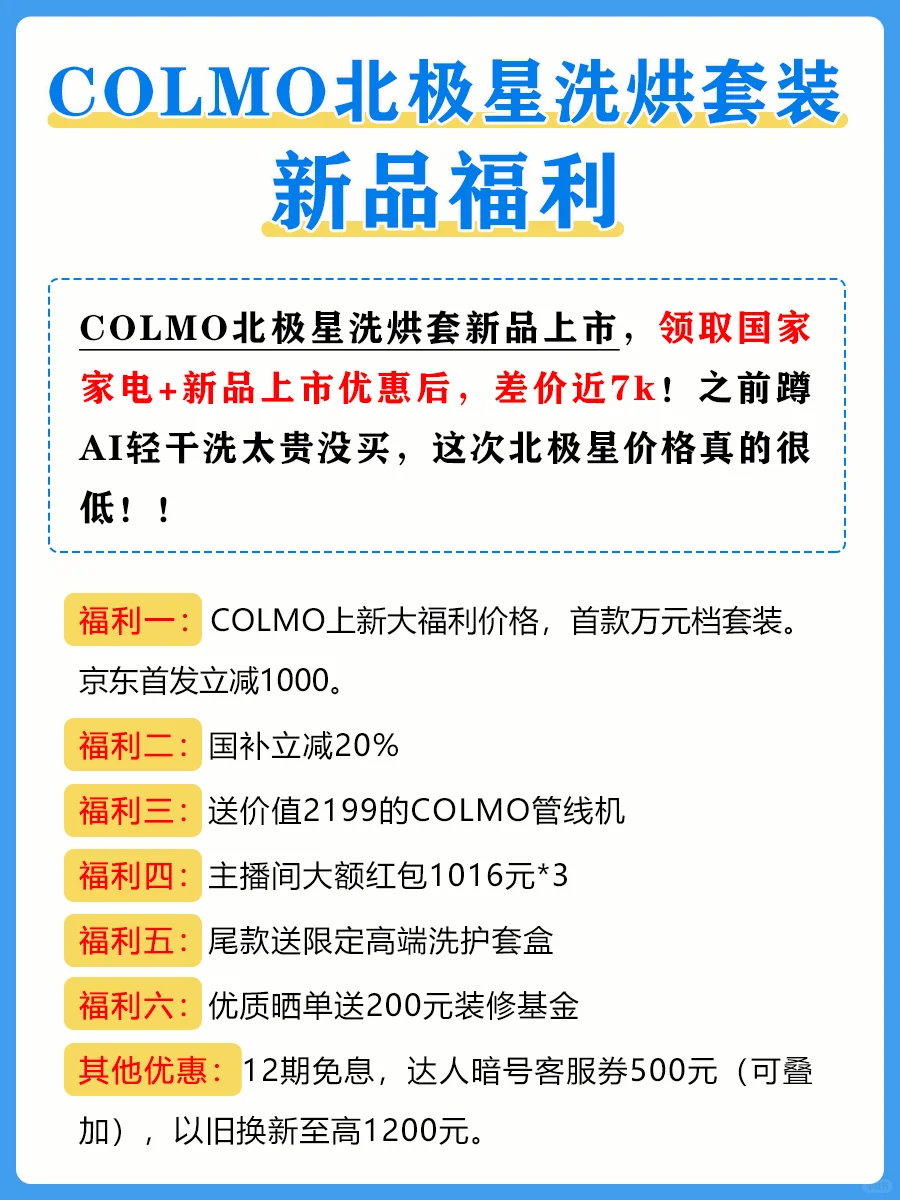 🎉 之前蹲AI轻干洗太贵没买,这次COLMO北极星洗烘套新品上市,领取国家补贴能减2000元+新品上市优惠能减3000元!加上晒单和优惠券到手8K多!还送2199元的净水器伴侣和799的高端干洗套盒!我看新品保价双十一,又能蹭到新品上市大福利,又能蹭到国补,双十一都没这么王炸的福利,姐妹们快冲。