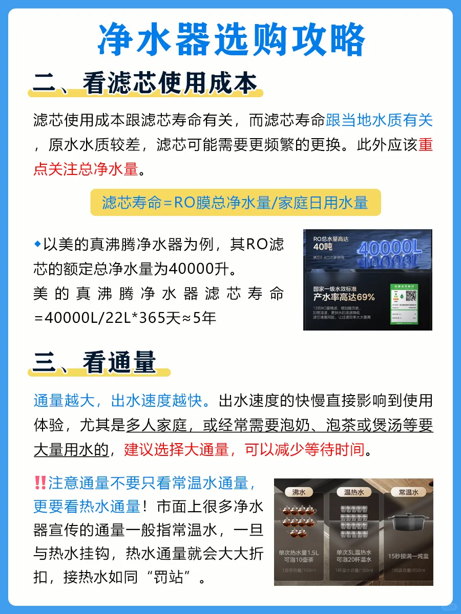 滤芯使用成本跟滤芯寿命有关,而滤芯寿命跟当地水质有关,原水水质较差,滤芯可能需要更频繁的更换。此外应该重点关注总净水量。
