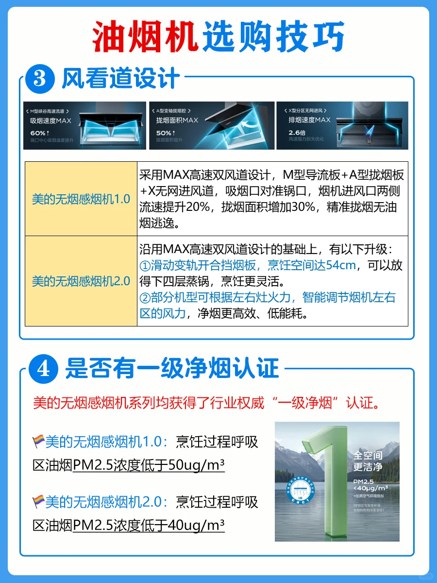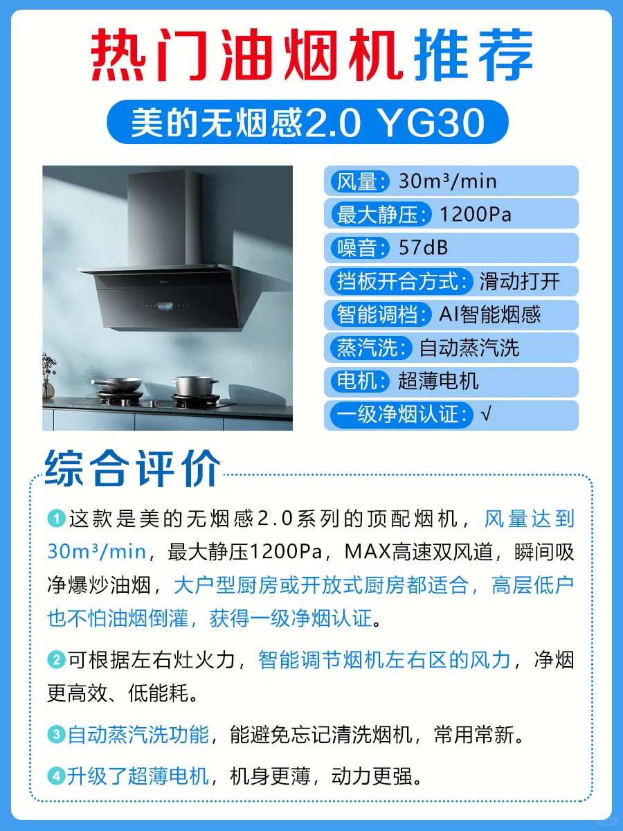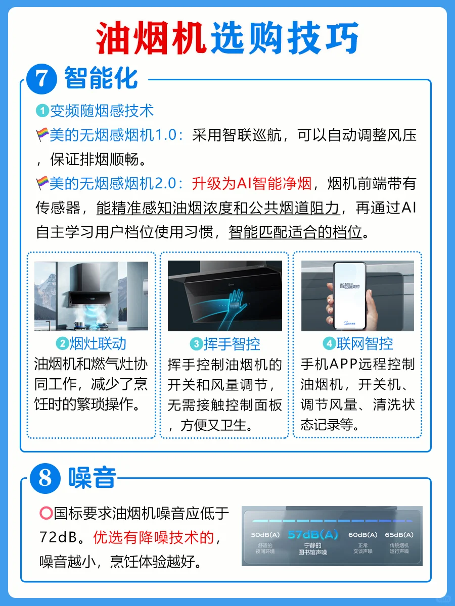 🔸美的无烟感烟机2.0:升级为AI智能净烟,烟机前端带有传感器,能精准感知油烟浓度和公共烟道阻力,再通过AI自主学习用户档位使用习惯,智能匹配适合的档位。
