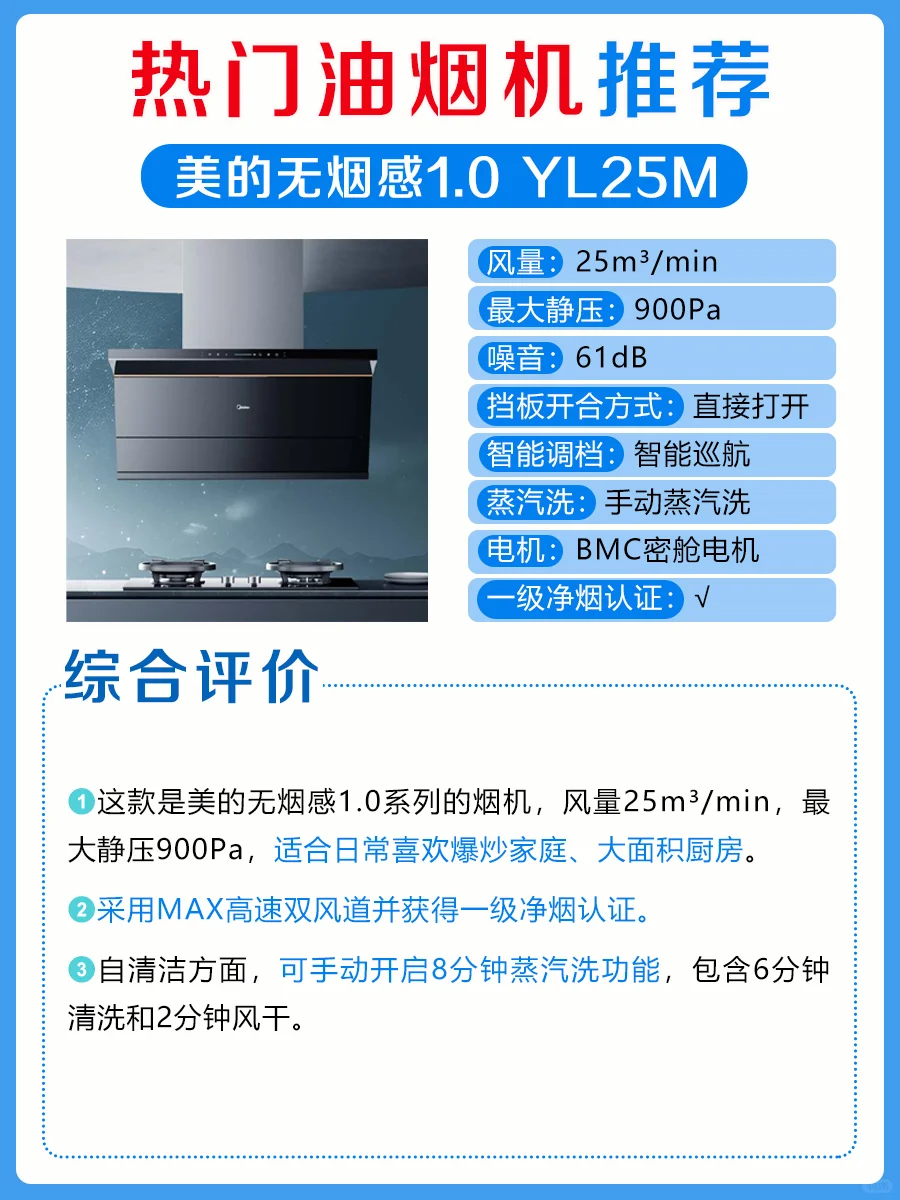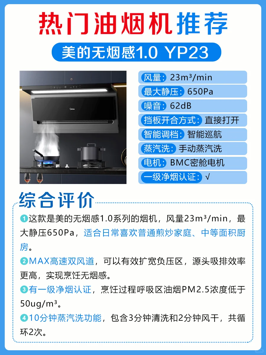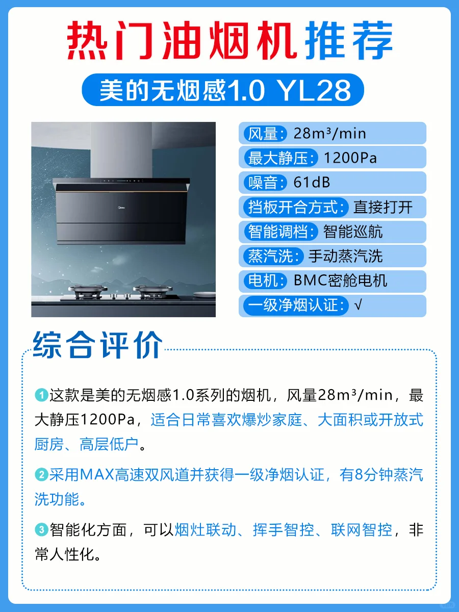 🔸美的无烟感烟机1.0:采用智联巡航,可以自动调整风压,保证排烟顺畅。