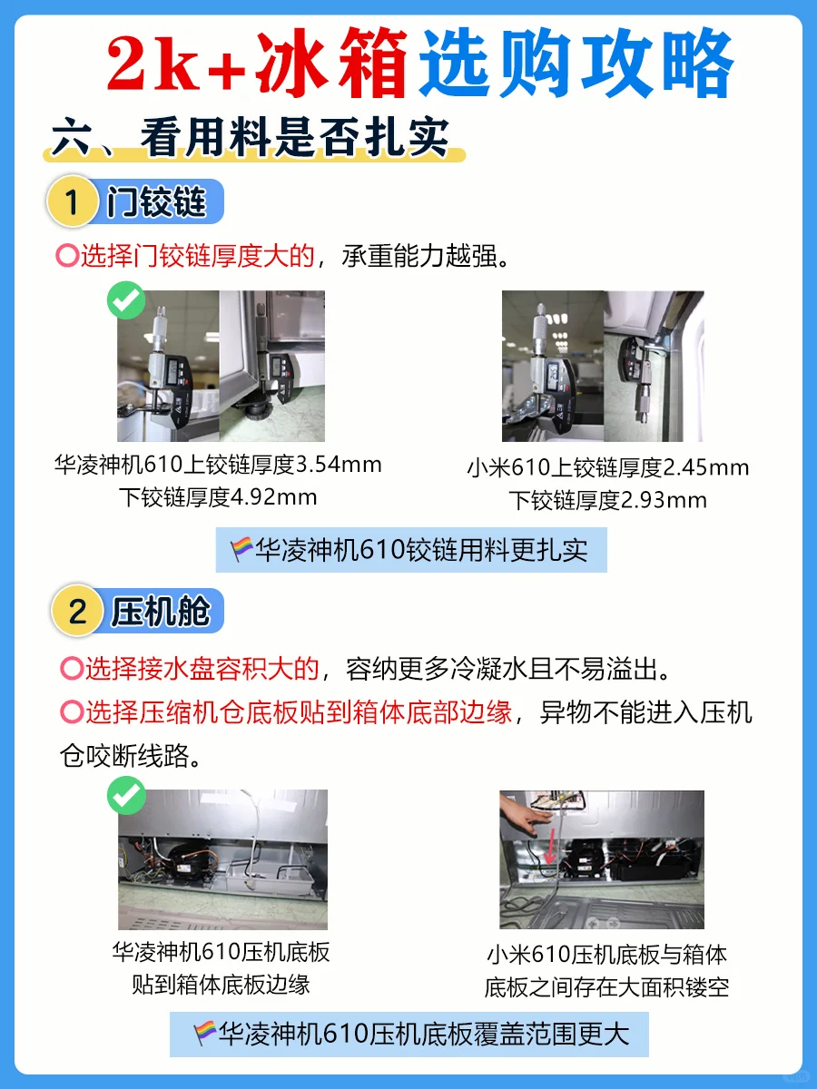 🔸抽屉、玻璃搁架、门铰链,压缩机底板配件用料足,强度高,更耐用。