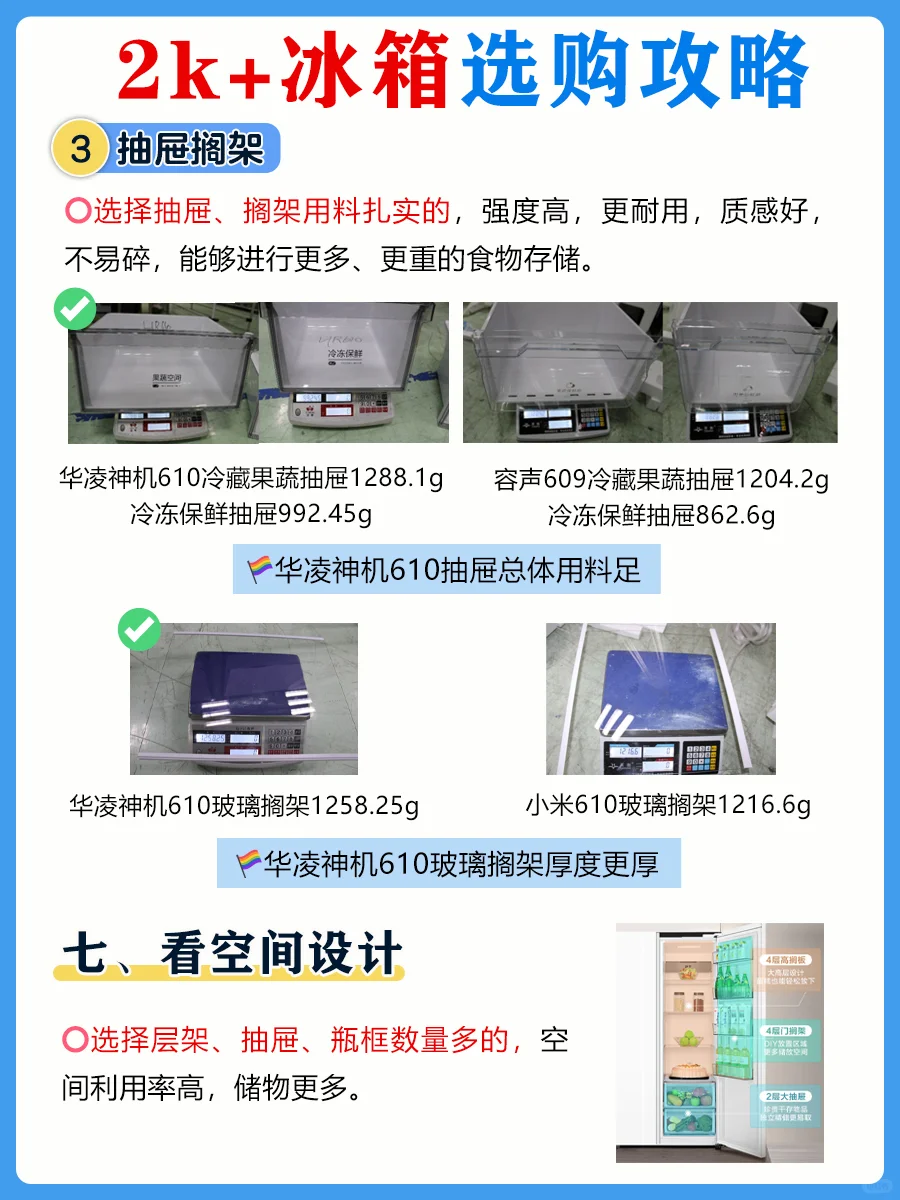 ✅选择层架、抽屉、瓶框数量多的,空间利用率高,储物更多。