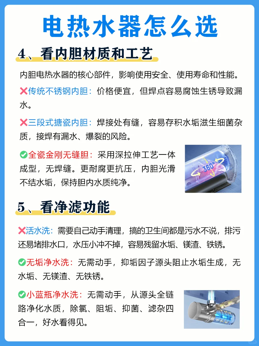 ✅选全瓷金刚无缝胆:采用深拉伸工艺一体成型,无焊缝。更耐腐更抗压,内胆光滑不结水垢,保持胆内水质纯净。