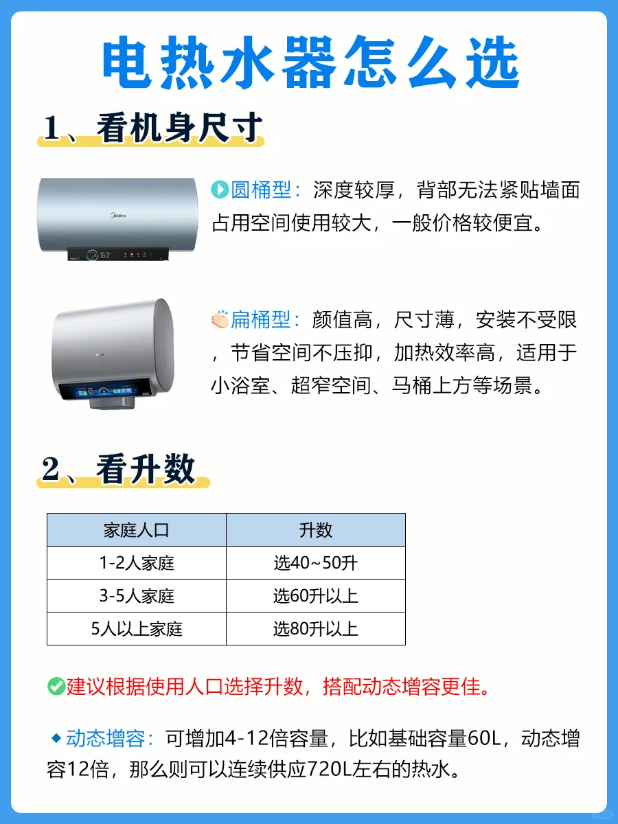 小浴室、超窄空间、马桶上方等场景,👉🏻选扁桶型,颜值高,尺寸薄,安装不受限,节省空间不压抑,加热效率高。