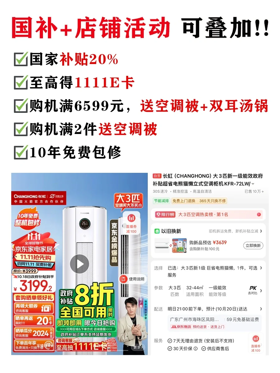 🔥这次JD长虹品牌双十一活动,力度真的给足了!不仅有品牌优惠,还叠加了国家补贴,还能以旧换新,送的礼品也是超丰富的~想要入手高性价比空调的小伙伴们一定不要错过了!!