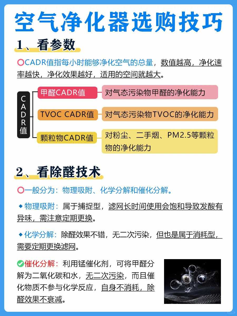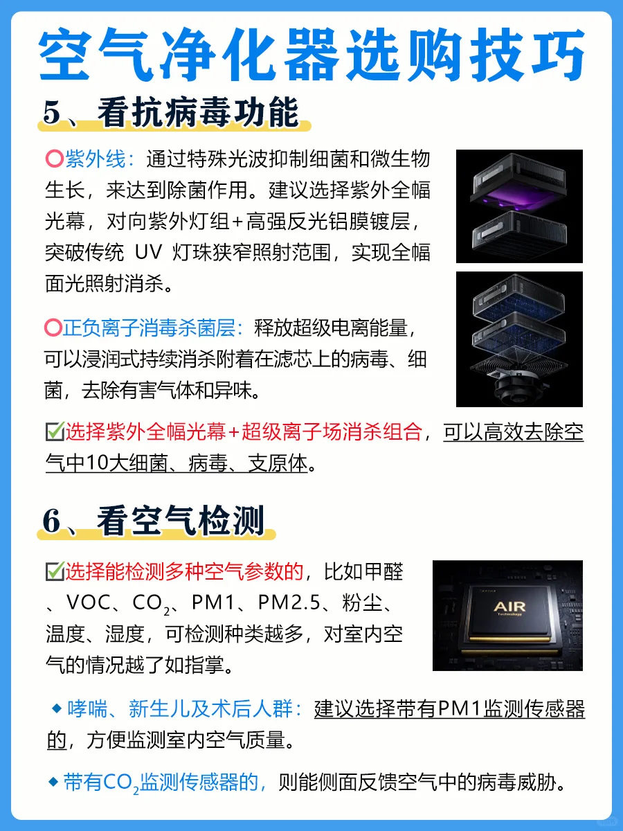 选择能检测多种空气参数的,比如甲醛、VOC、 CO₂、PM1、PM2.5、粉尘、温度、湿度,可检测种类越多,对室内空气的情况越了如指掌。