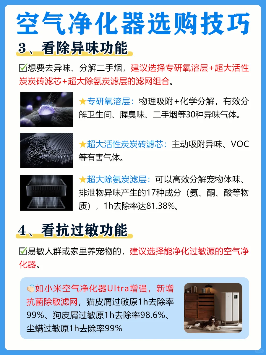 易敏人群或家里养宠物的,建议选择能净化过敏原的空气净化器。
