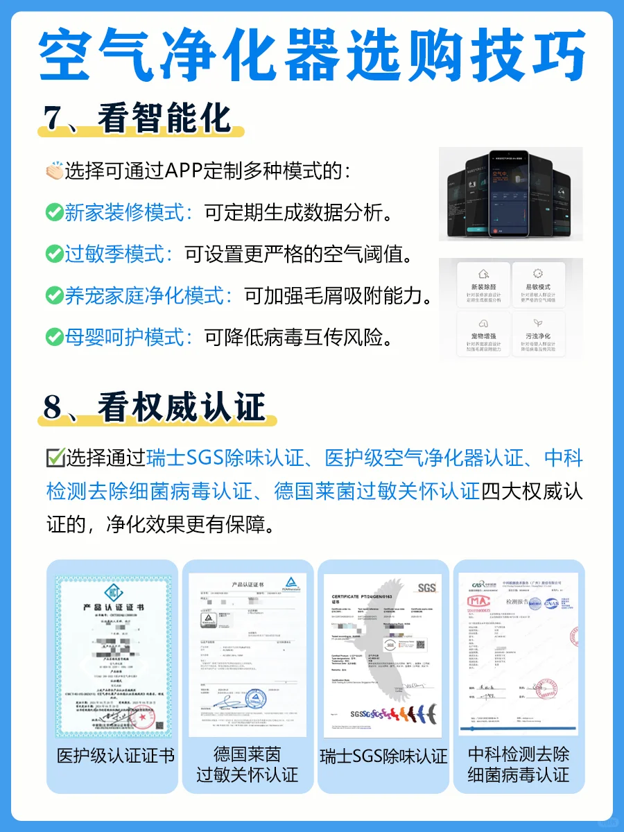 选择通过瑞士SGS除味认证、医护级空气净化器认证、中科检测去除细菌病毒认证、德国莱菌过敏关怀认证四大权威认证的。