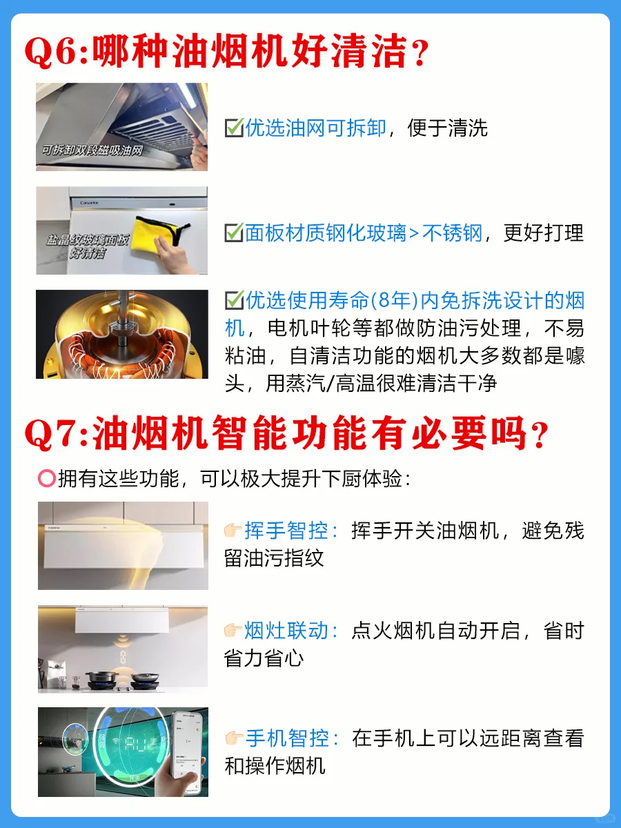 优选使用寿命(8年)内免拆洗设计的烟机,电机叶轮等都做防油污处理,不易粘油,自清洁大多数都是噱头,用蒸汽/高温很难清洁干净