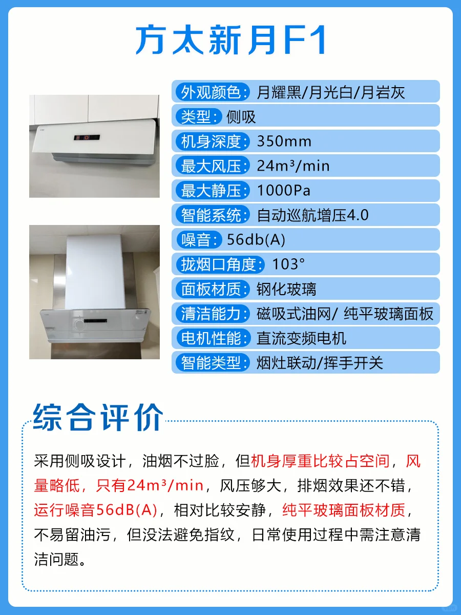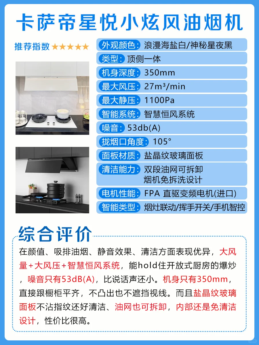 👉🏻3款热门油烟机机型的对比推荐放在图6-9啦,我选择了卡萨帝星悦小炫风油烟机,它顶侧一体的设计非常适合小厨房和开放式厨房,既节省空间又能保障排烟效果。还有27m³/min的大风量和1100Pa的大风压,油烟根本没机会逃到其他房间。海盐白色系的盐晶纹玻璃面板又好看又方便打理。
