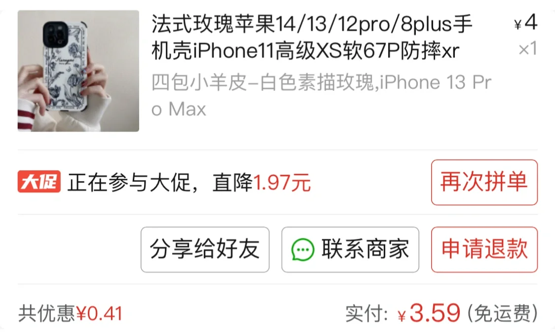 我急性子了吧,手机总掉地上,前几天骑电动车,衣服兜没拉链,手机快速摔到地上,好在发现捡回来,好在手机没摔坏,但手机壳废了。 懒得选,就买以前买过的吧,花纹我很喜欢,几十秒下单,太省力了! 所以以后发现好东西我就复购吧,不费力去追求新奇的别样的,坚持用下去。 顿悟这就是拼多多人传人的秘诀,因为大家都相信亲友买过的。