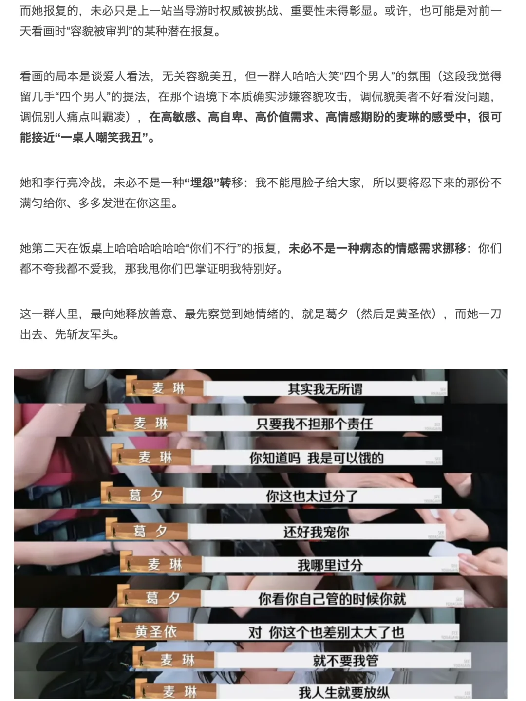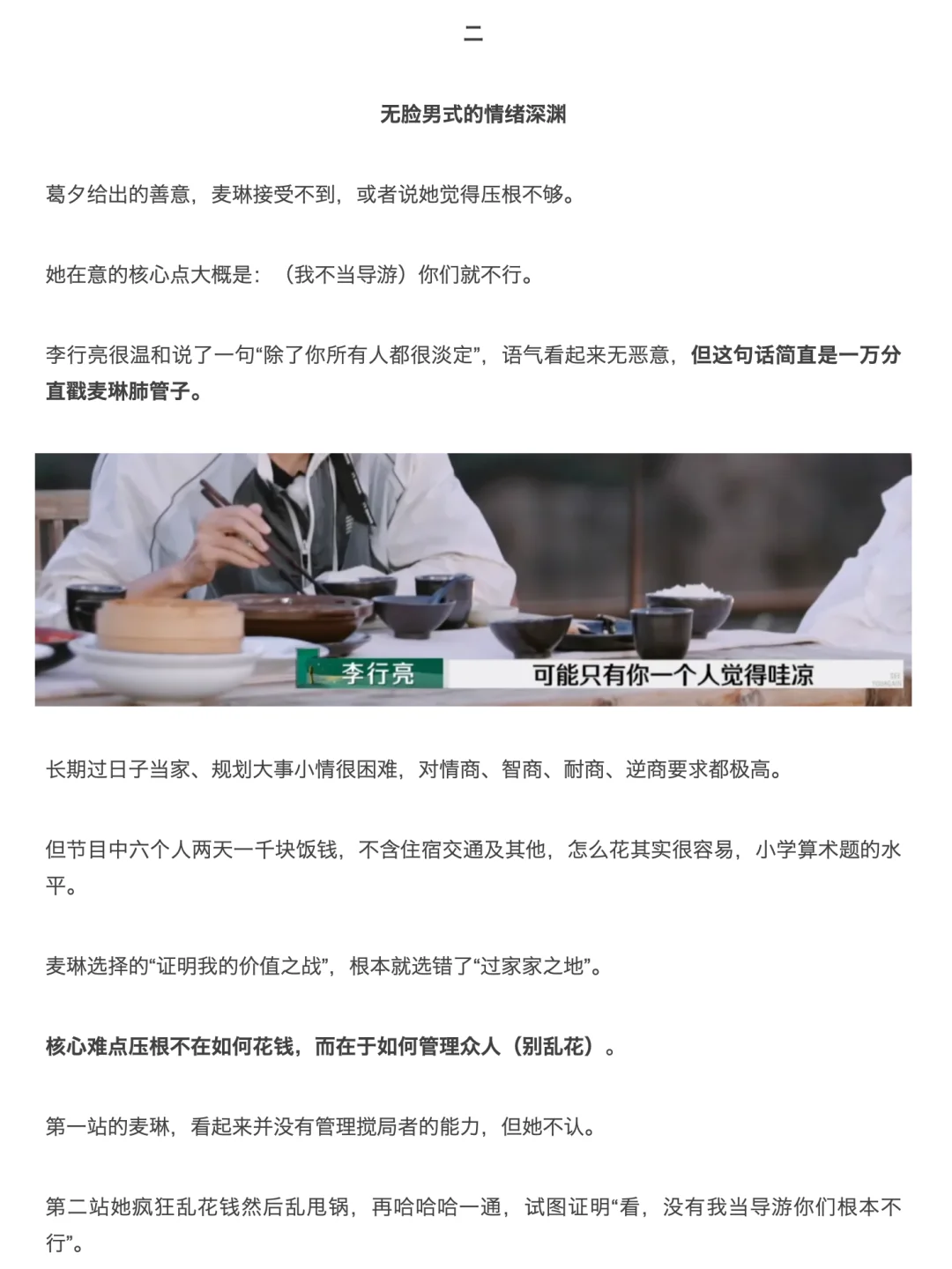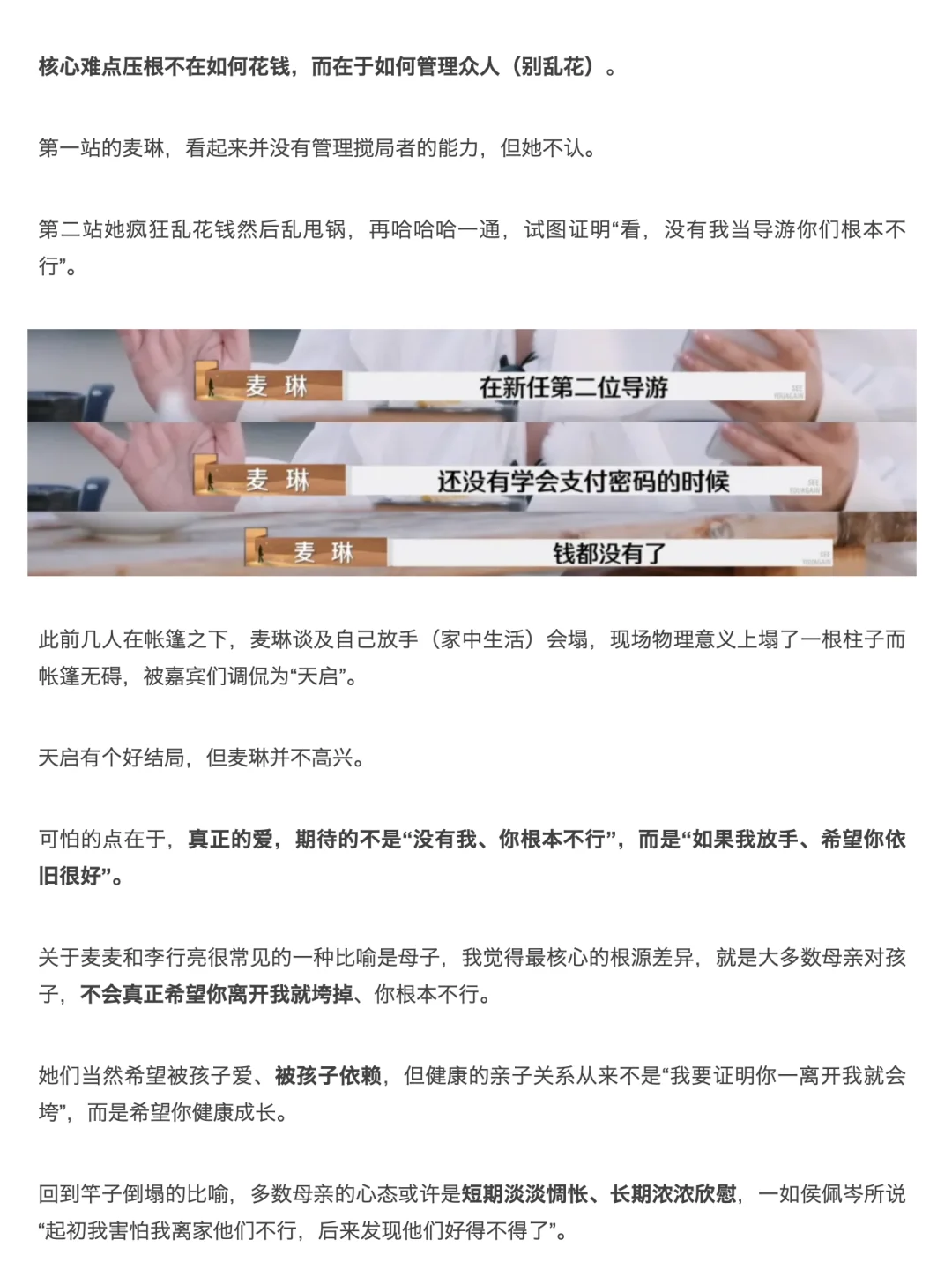 你看,节目中一千块钱花销的规则,第一站杨子根本不在意、践踏规则(没有任何说杨子对的意思),留几手表示“我愿意不吃早饭换买烟钱”,彼时是麦琳自己当导游,她格外重视规则、格外操心大家