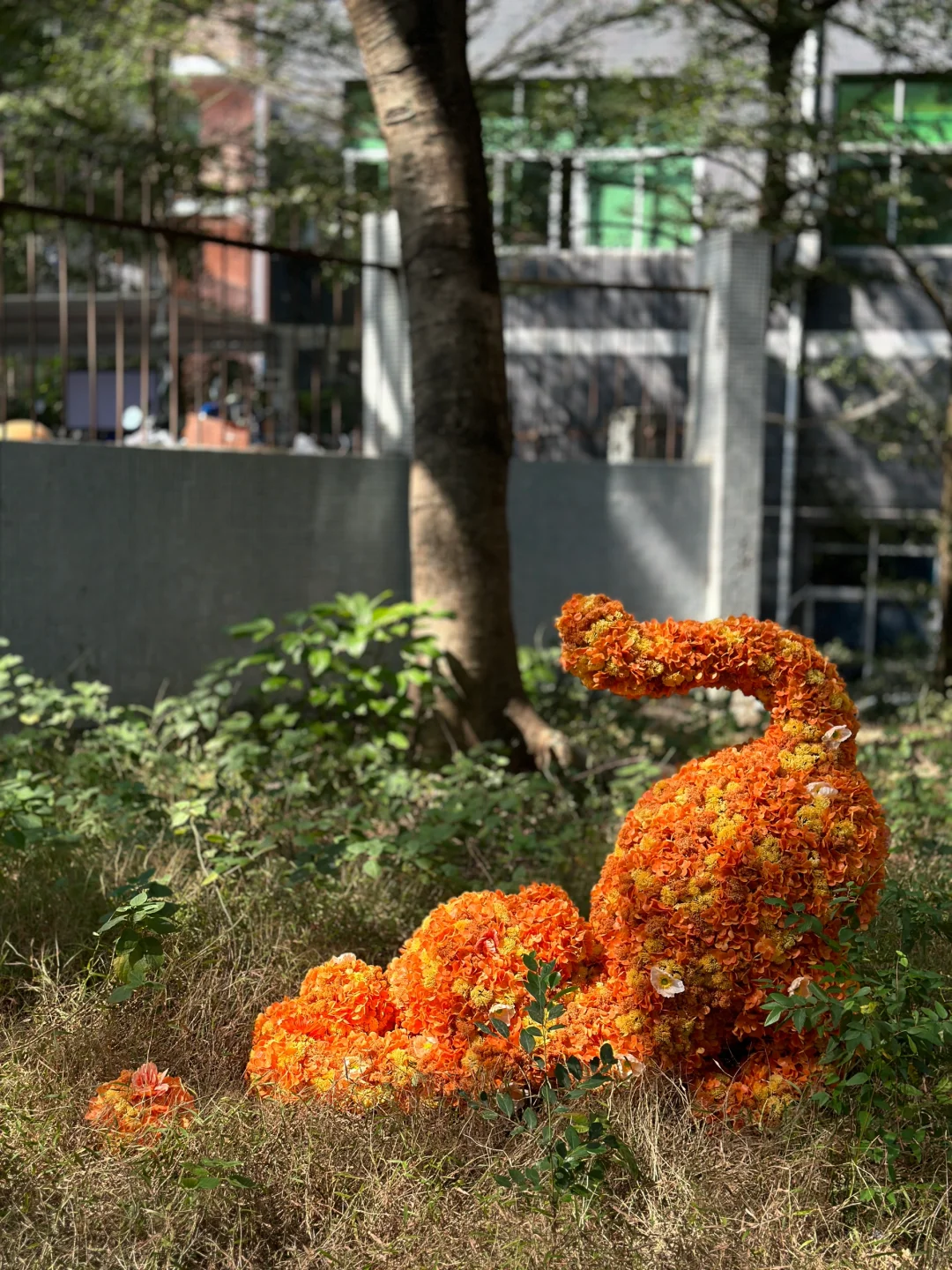 仿真花做的花猫才是真正的花猫吧!树脂造型的猫咪造型在外表用花装饰!伸着懒腰追逐着花球。