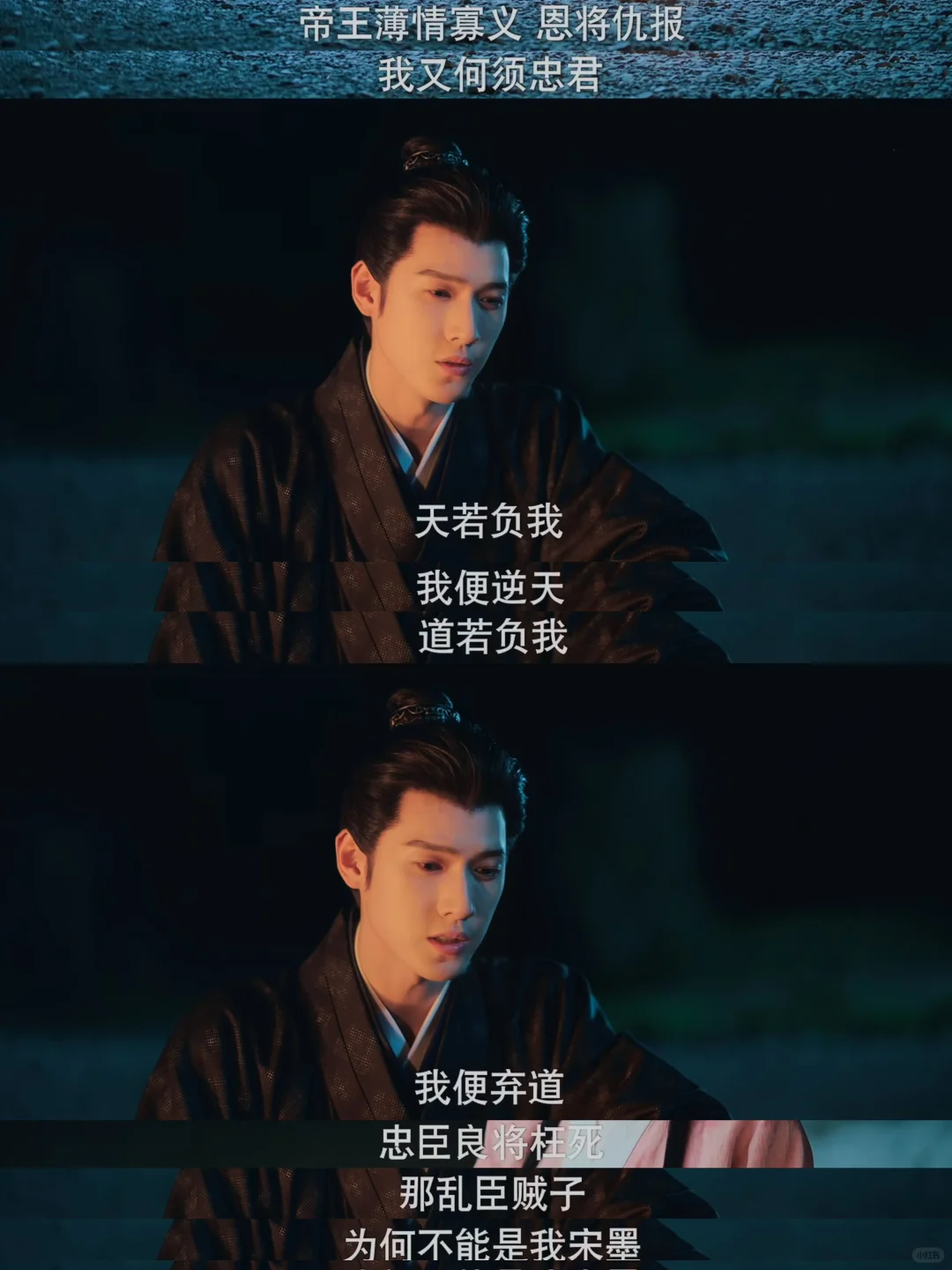这段宋墨质疑忠孝,“帝王薄情寡义、恩将仇报,我又何须忠君”。和崔老太太不屑封建礼教那一套一样,都是“穿透时光的先进”模式,只是宋墨多了几分悲怆之下的负气、黑化、自毁倾向