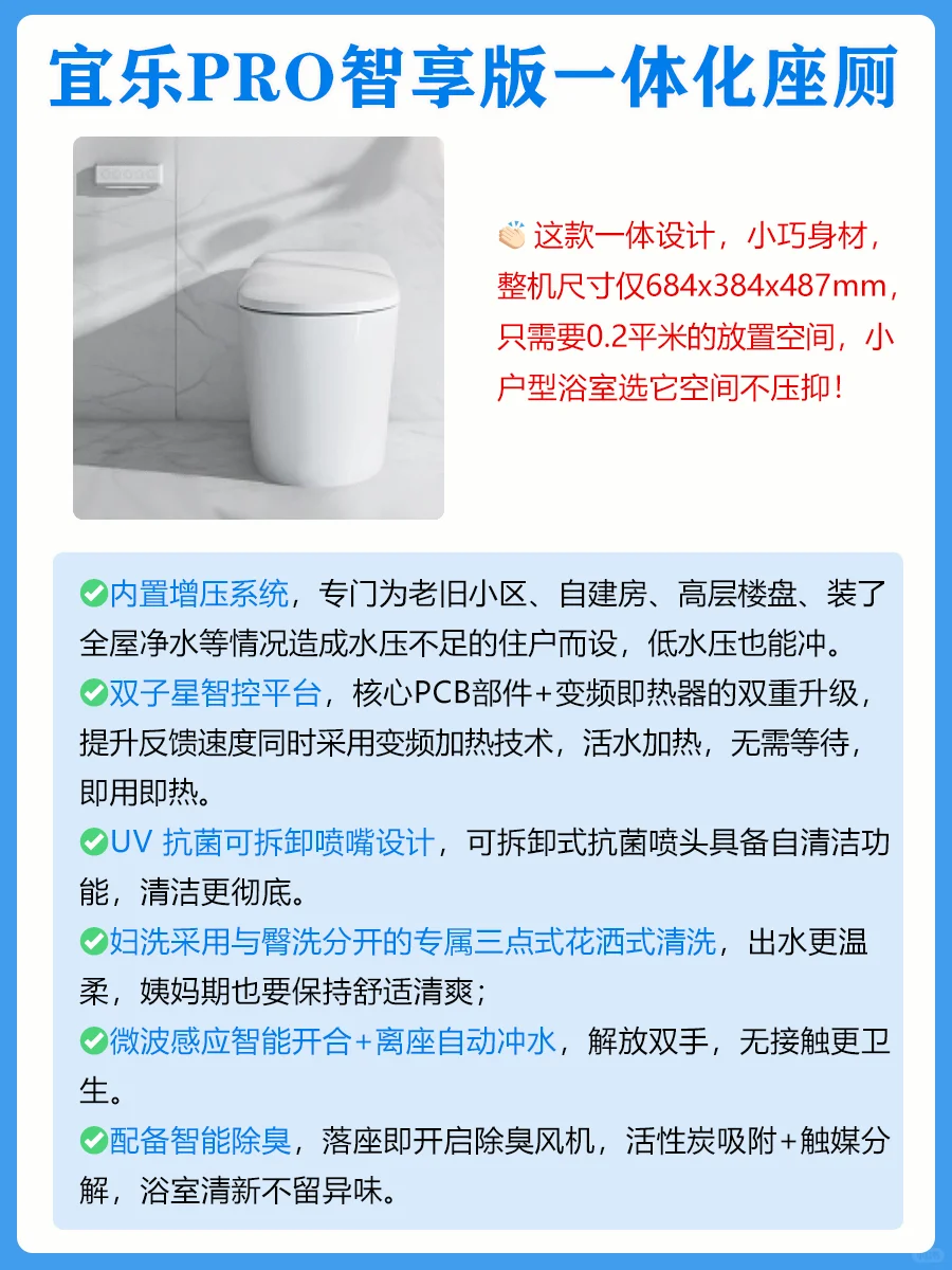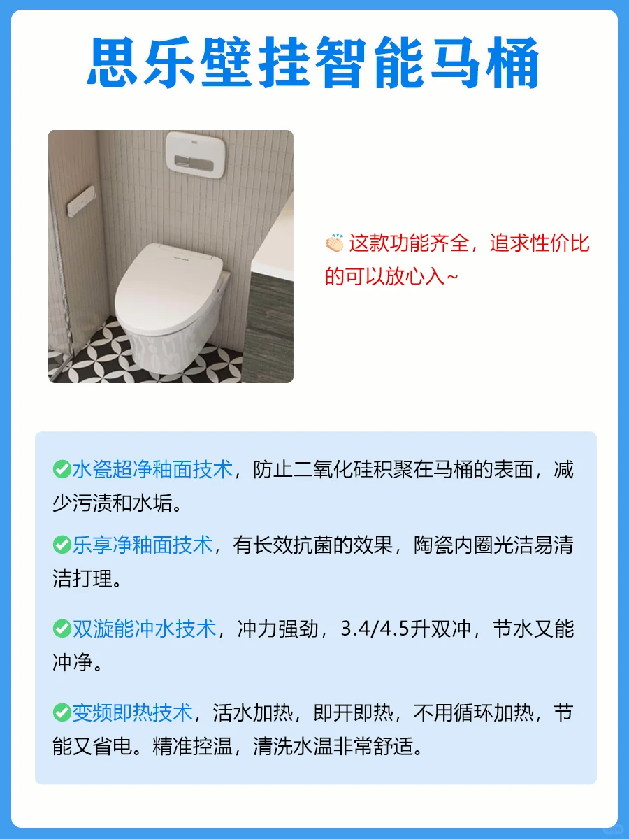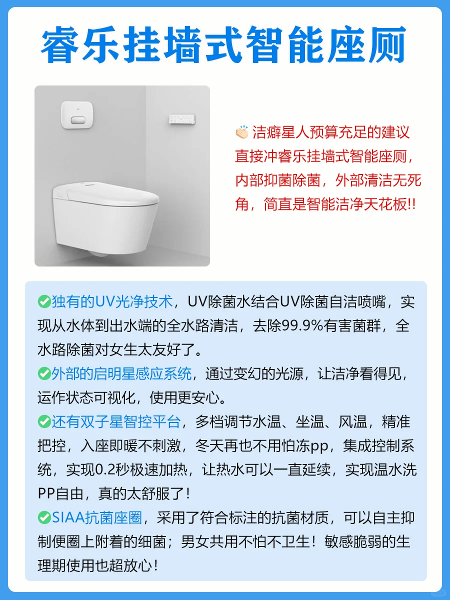 预算充足的建议直接冲睿乐挂墙式智能座厕,内部抑菌除菌,外部清洁无死角,简直是智能洁净天花板!!