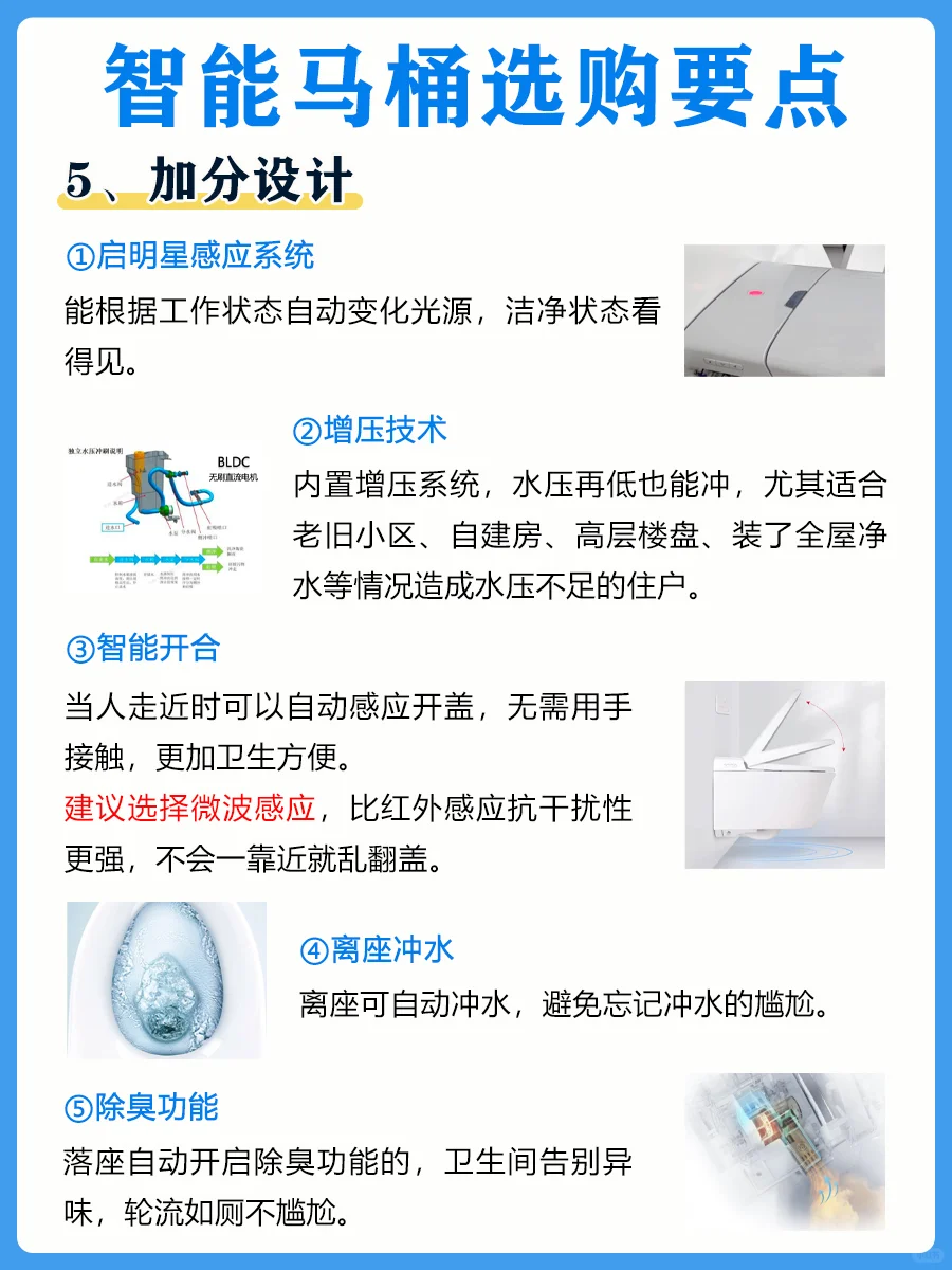 ① 增压技术;②智能开合;③离座冲水 ;④除臭功能