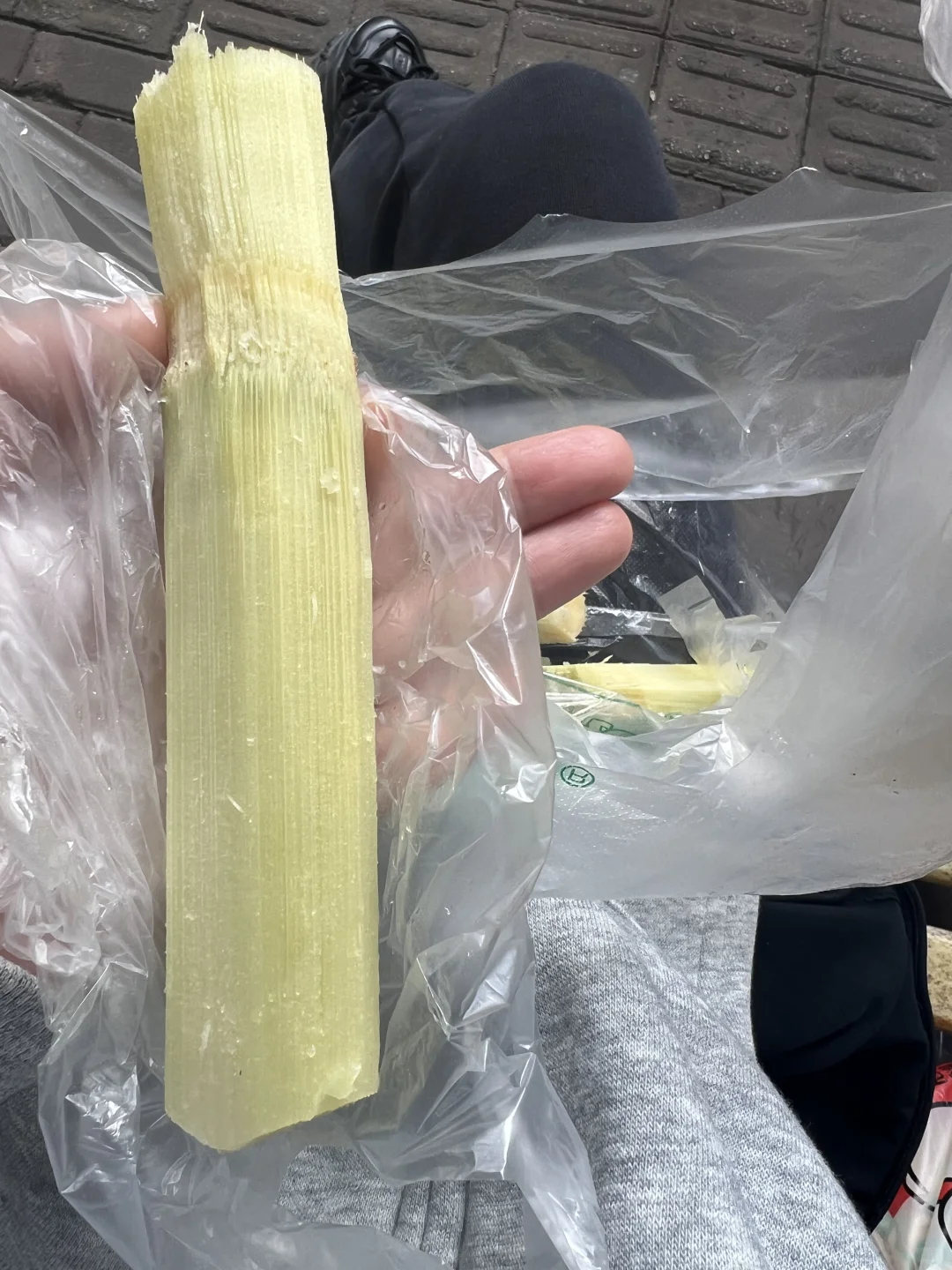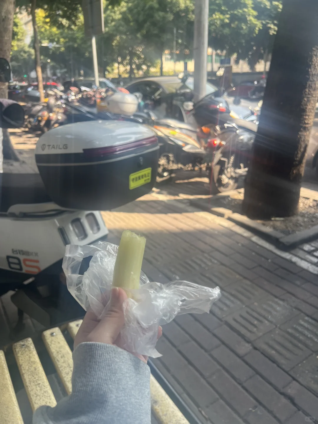 买完才反应过来,懒得拎这一袋子,于是顺势坐到路边休息椅上开始啃,面对着车来车往的大马路,悠哉地啃完了一整根。