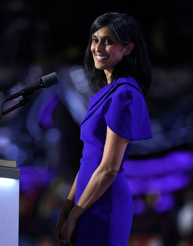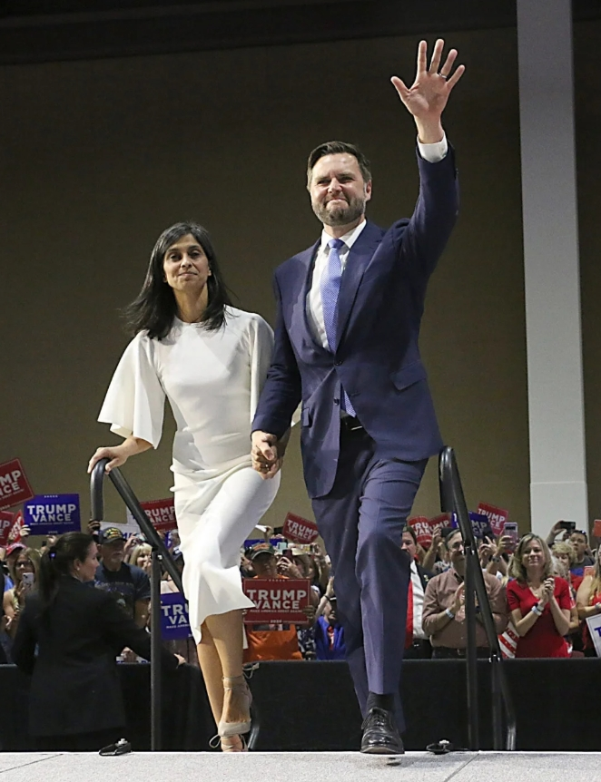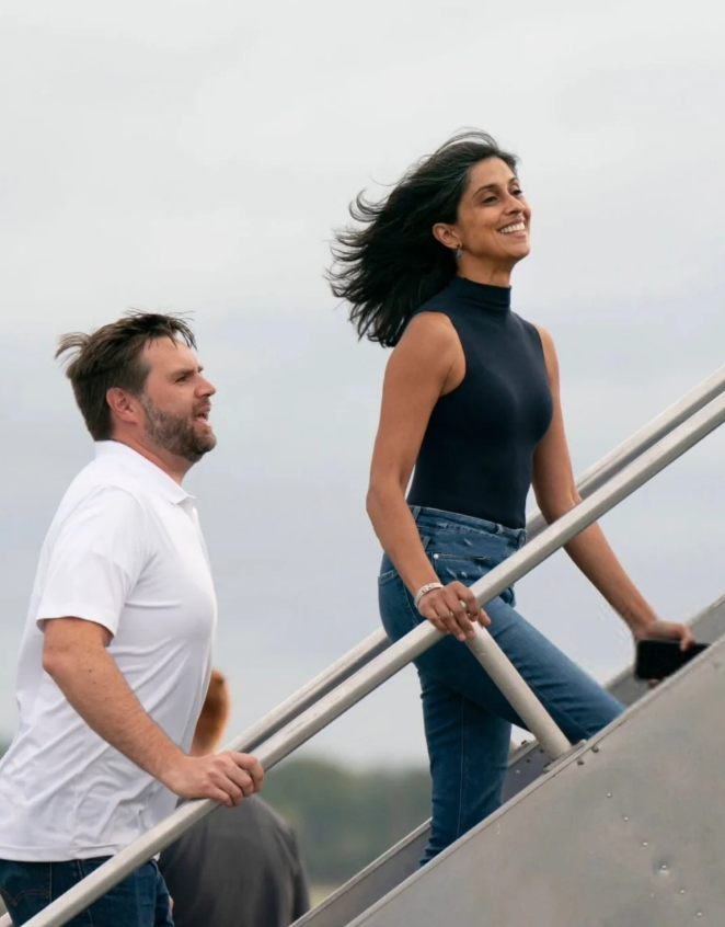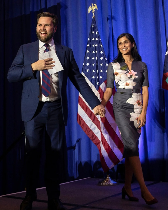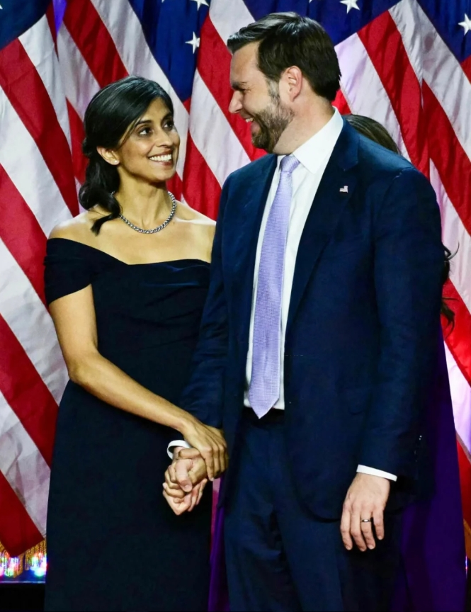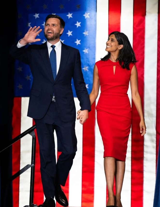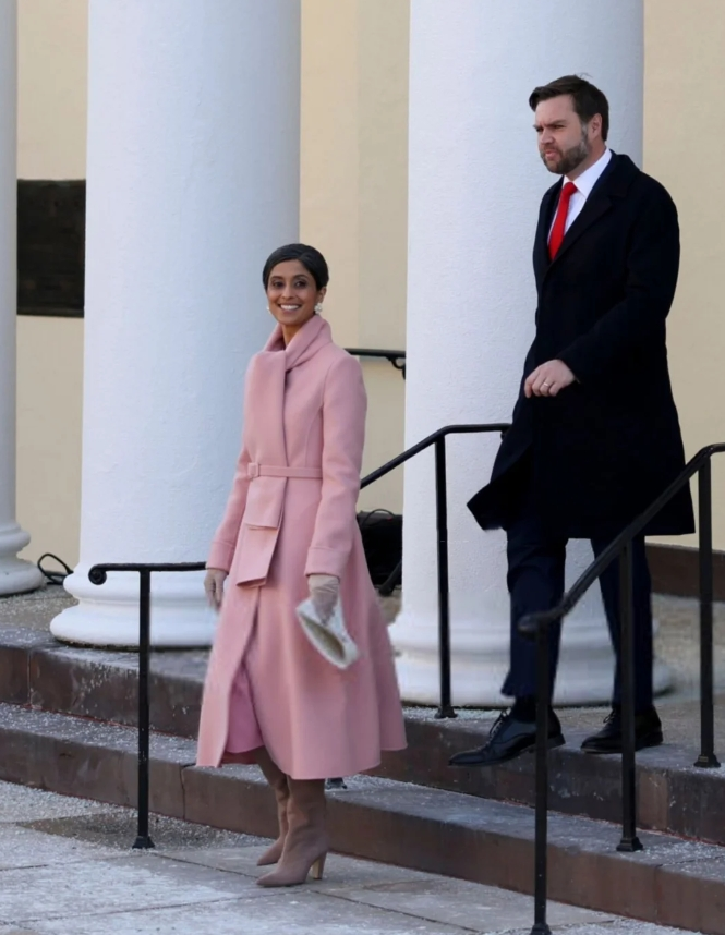 刚刚在电视上看总统就职典礼,副总统JD Vance宣誓时,在他一旁全称注视着他的妻子Usha Vance,好眼前一亮。 在耶鲁攻读法学学士期间就被评为耶鲁大学最美50名学生的Usha,后来还在耶鲁完成了法学博士学位,父母都是印度移民。 在成为“第二夫人”前,她曾担任过包括首席大法官约翰·罗伯茨、法官布雷特·卡瓦诺和法官阿穆尔-塔帕尔的联邦法官法律助理,后任职于芒格、托尔斯&奥尔森律师事务所,去年7月因丈夫身份转变而正式离开公司。 39岁,美国一流律所,linkedin显示入职五年有余,公开数据预估年薪在30万美金左右,就这样成为了丈夫竞选路上的最强助攻。 回看助选路上造型,上台的精英俐落,下场的简约大气,她的造型总有种不费力的优雅自在。 而今天的粉色毛呢套装,也是政坛久违的一抹淡色,好是亮眼。
