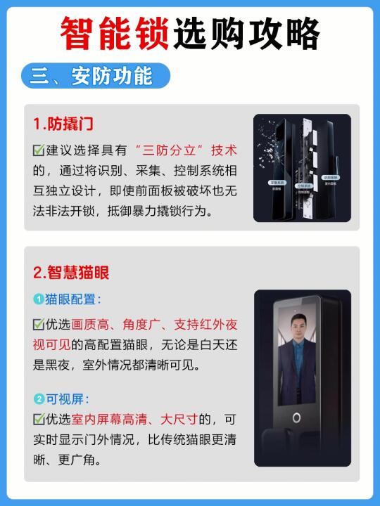 ✅选择具有“三防分立”技术的,即使前面板被破坏也无法非法开锁。