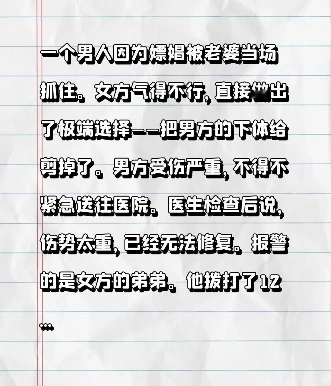 丈夫出轨遭极端报复,女方被抓坐牢,两个孩子成了无辜的牺牲品。 你有没有觉得,现在社会上有些事儿真是让人看不懂?明明是男人出轨在先,结果老婆一怒之下剪掉了他的下体,反而被抓进去坐牢了。这事儿听起来是不是有点离谱? 前几天,一个男人因为嫖娼被老婆当场抓住。女方气得不行,直接做出了极端选择——把男方的下体给剪掉了。男方受伤严重,不得不紧急送往医院。医生检查后说,伤势太重,已经无法修复。报警的是女方的弟弟。他拨打了120,并希望通过自首为姐姐争取从轻处理的机会。 男方的态度让人无语。他写了谅解书,但不是因为他真心原谅了妻子,而是因为他自己没能力照顾两个孩子——一个3岁,一个6岁。男方承认自己的过错,也表示不愿意承担照顾孩子的责任。他希望通过这份谅解书,让妻子尽快出来照顾家庭。 这件事在网上炸开了锅。一部分人觉得,女方的行为虽然是出于愤怒和绝望,但确实太过极端,超出了法律允许的范围。另一部分人同情女方,认为男方的出轨行为是导致这一切的根本原因。还有人指出,社会对女性的支持和帮助不足,尤其是在面对家庭暴力或伴侣背叛时,女性往往缺乏有效的应对机制。这种情况下,女方的情绪失控是可以理解的,但不应该成为她犯罪的理由。 最让人揪心的是两个孩子。他们无疑是这场悲剧的最大受害者。无论最终的结果如何,夫妻关系已经无法修复。离婚几乎是不可避免的选择。孩子未来的成长环境和心理健康,成为了所有人关注的焦点。两个这么小的孩子,突然失去了母亲的陪伴,这对他们的心理影响将是巨大的。 这件事不仅仅是一个家庭的悲剧,它暴露了社会中许多深层次的问题。婚姻中的信任和沟通至关重要,任何一方的背叛都会对家庭造成不可挽回的伤害。社会应为弱势群体提供更多的支持,尤其是当家庭内部发生矛盾时,应该有专业的心理咨询和法律援助介入,避免极端事件的发生。 每个人都有选择的权利,但也要为自己的选择负责。无论是男方的出轨,还是女方的极端行为,都不是解决问题的正确方式。希望这个事件能够引起更多人对家庭关系和社会支持系统的重视,避免类似的悲剧再次发生。 如果你觉得这篇文章对你有启发,欢迎点赞、转发,让更多人看到。关注我,我们一起探讨更多有意义的话题!