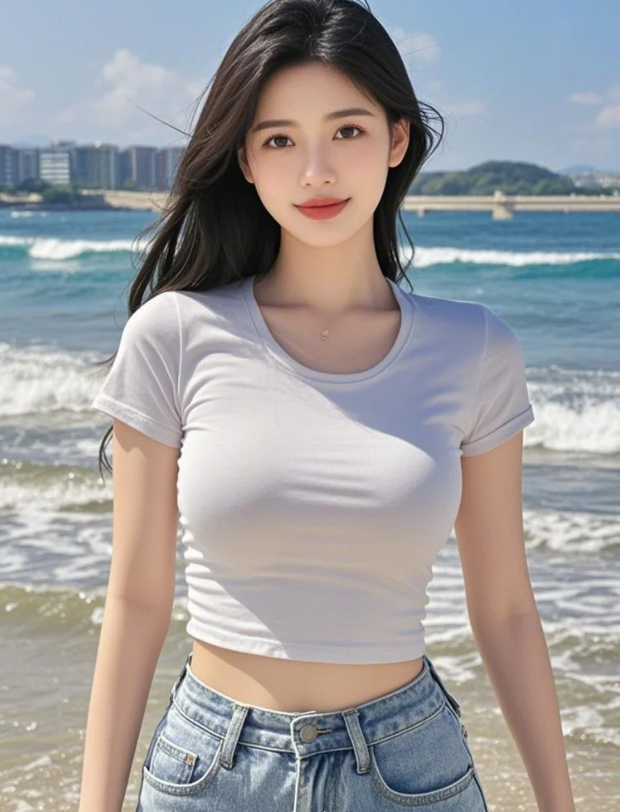 沙滩长发女孩,晚风轻抚,笑容温柔而充满神秘