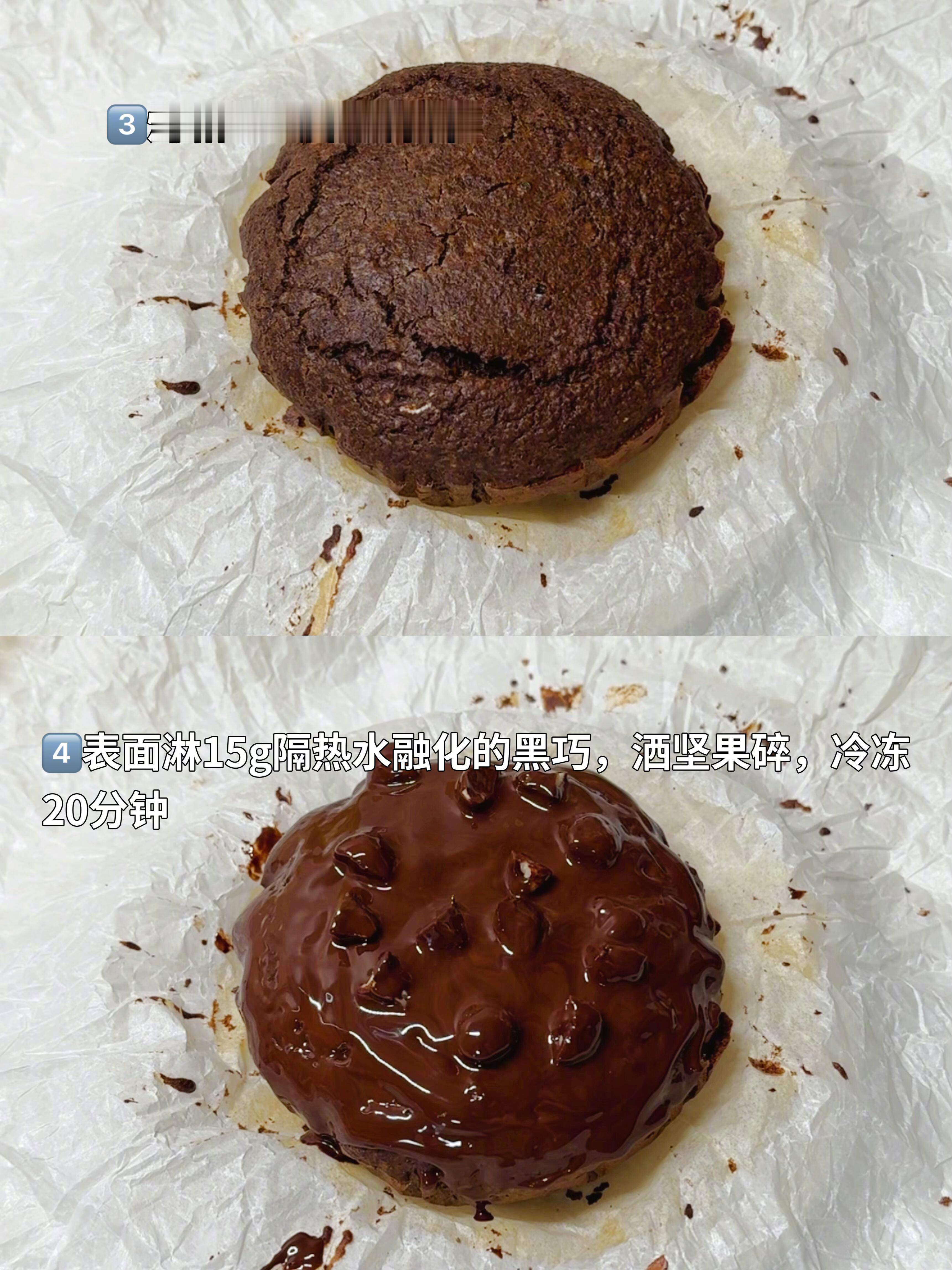 4️⃣表面淋15g隔热水融化的黑巧,洒坚果碎,冷冻20分钟让黑巧凝固