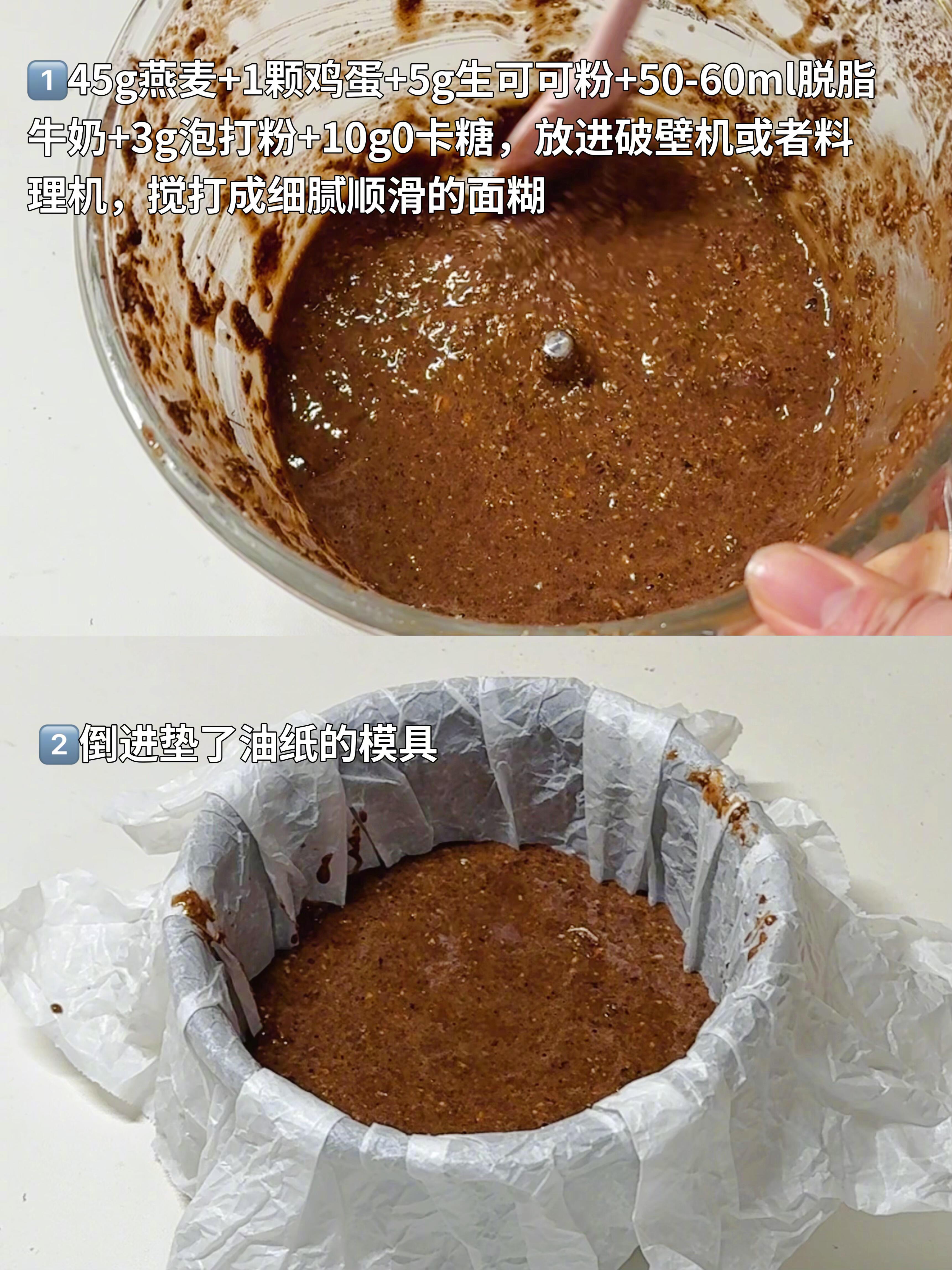 1️⃣45g燕麦+1颗鸡蛋+5g生可可粉+50-60ml脱脂牛奶+3g泡打粉+10g0卡糖,放进破壁机或者料理机,搅打成细腻顺滑的面糊