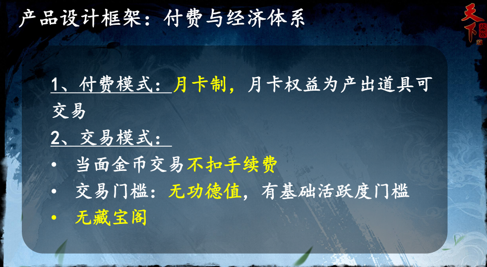 目前,《天下贰经典版》确认收费模式为月卡制,月卡的权益为产出道具可以交易,当面交易的金币不扣手续费。