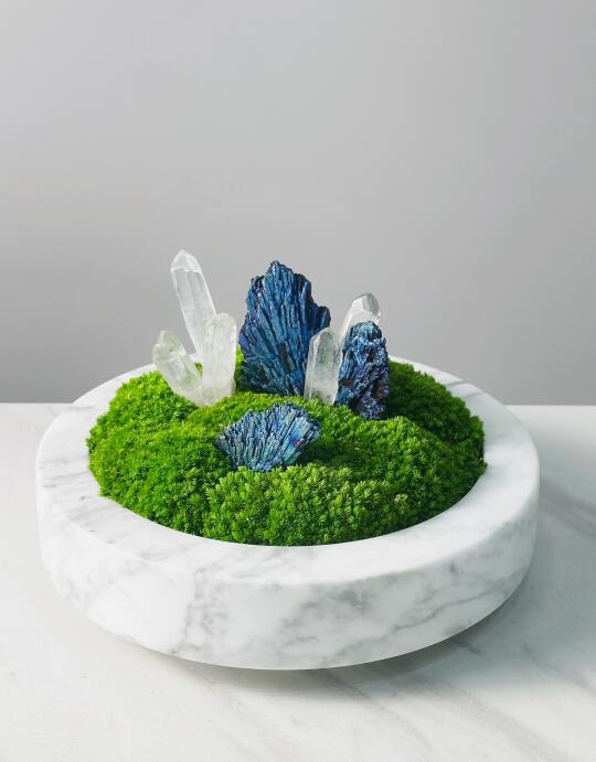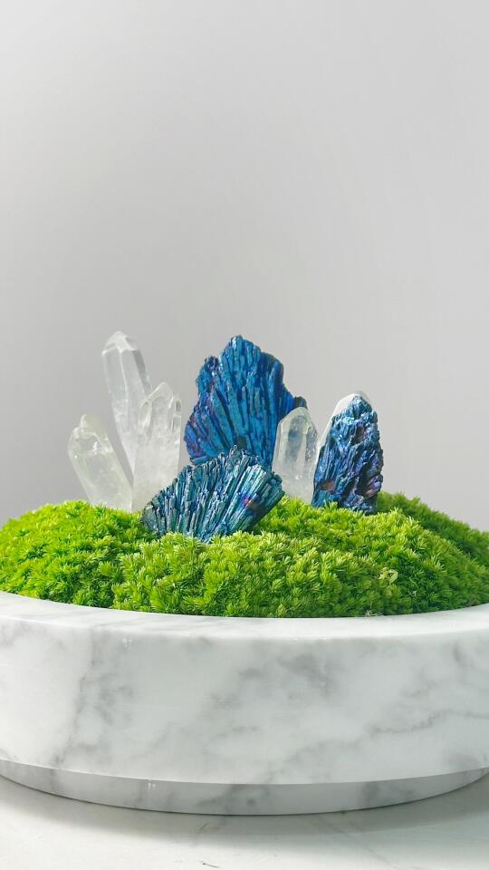 白水晶纯净通透,被视为能量的放大器,能净化磁场。而孔雀石那深邃迷人的蓝绿色,不仅颜值超高,还蕴含着强大的治愈力量。搭配上生机勃勃的苔藓,仿佛构建了一个小小的自然能量场🌿。