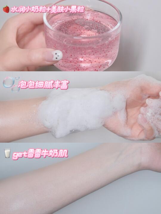 水润小奶粒+美肤小果粒 边洗边溶 释放双重营养