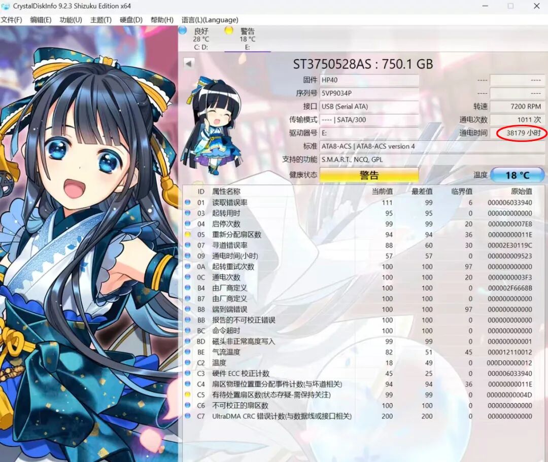 根据受害者测试,这个被调包的硬盘是750GB的3.5英寸机械盘,通电时间38179小时,健康状态都显示“警告”了,状态非常差。