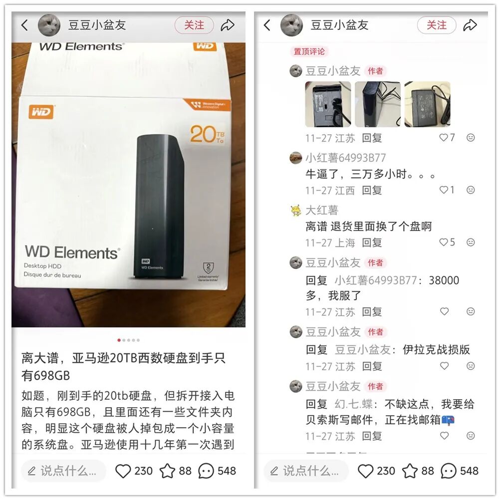 上个月末,美国亚马逊“黑五”大促搞过一波西数硬盘的特价,14T是1330元,20T是2084元,我没忍住买了14T。昨天有粉丝喊我快去小红书看戏,说海淘的西数硬盘翻车了,把我吓一跳。