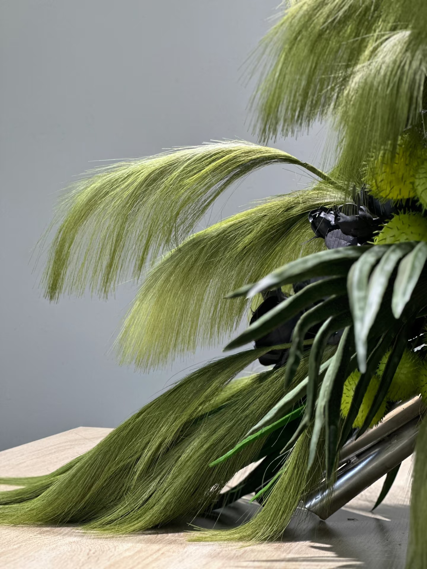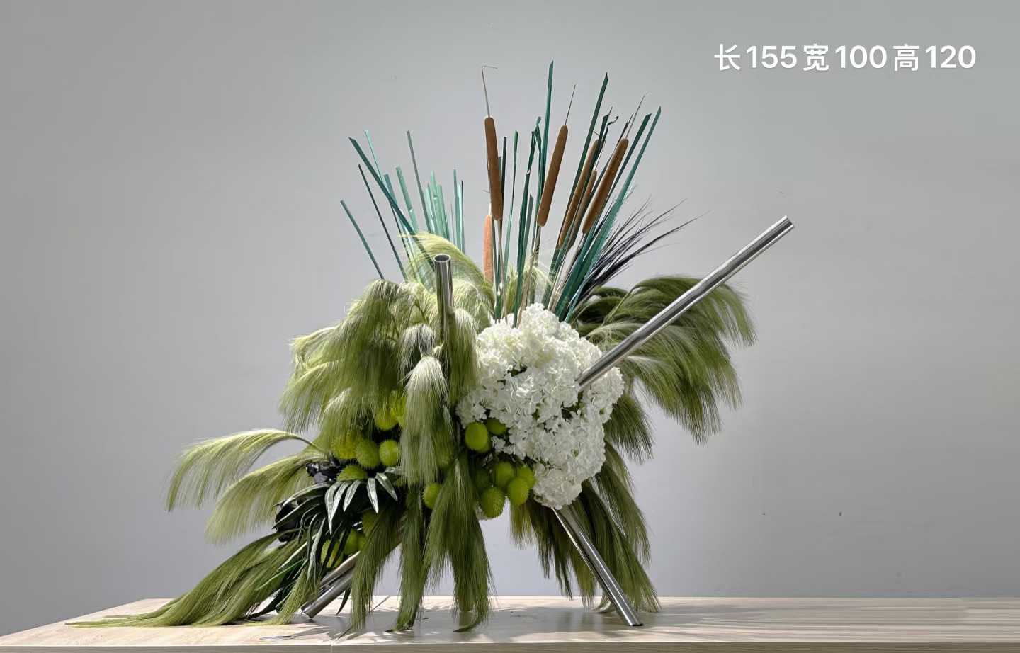 其中运用到的花料有绿毛球 、白色绣球,糖棉,还有蒲苇、蒲棒等植物材料,以及金属管等材料通过不同材质的组合、高低错落的搭配营造出独特的视觉效果。现代架构花艺常突破传统插花形式,借助非植物材料构建框架,展现创意与空间感 ,注重造型的立体感和设计感。