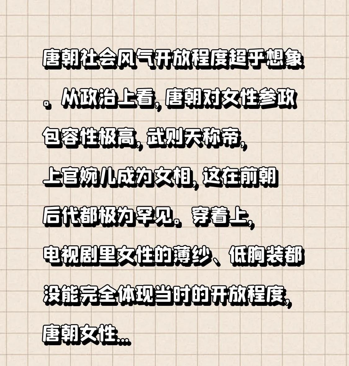 唐朝社会风气开放程度超乎想象。从政治上看,唐朝对女性参政包容性极高,武则天称帝,
