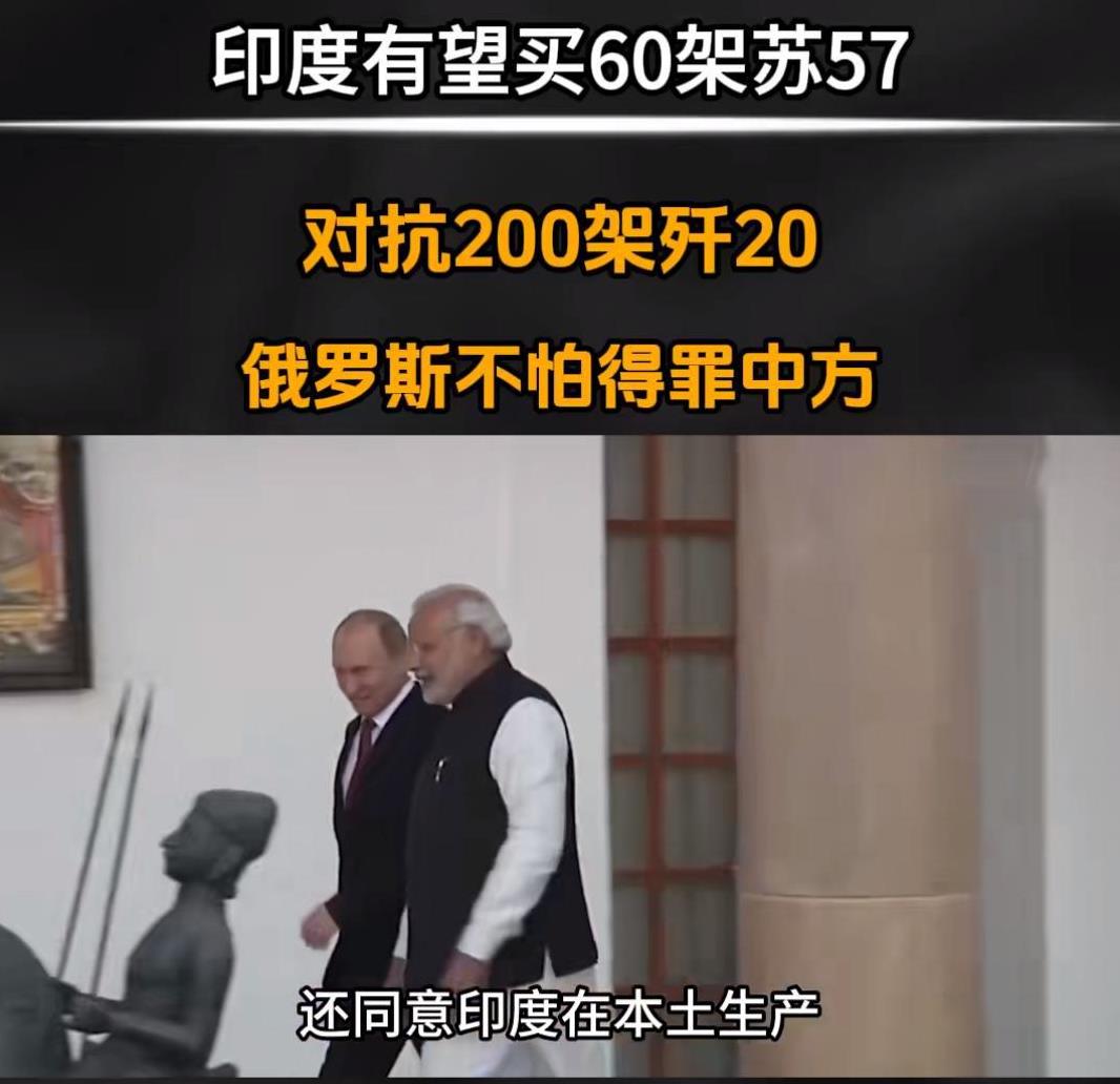 印度有望买60架苏57,对抗200架歼20,俄罗斯就不怕得罪中方吗? 印度要买60架苏57对抗歼20,看似俄罗斯不怕得罪中国,其实不然。俄罗斯如今被西方制裁,急需外汇,或许这只是笔生意。苏57在俄乌战场表现不佳,雷达技术落后,歼20氮化镓雷达和隐身涂层领先很多。 以印度的工业水平,印度组装调试苏57都得好几年,还不一定造出合格品。俄罗斯所谓的技术转让也不完整。 中俄关系稳固,俄罗斯不会因这点利益得罪中国这个大伙伴。而印度花大价钱买苏57,面对巴基斯坦或将要获得的歼35还不一定能占优势,如此可见,这更像是印度花钱买个心理安慰罢了。