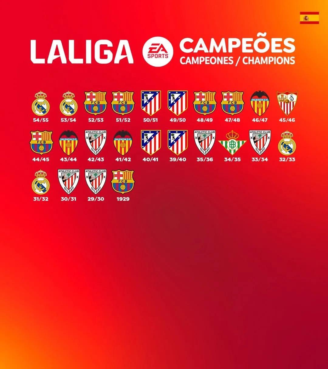 西甲即将迎来百年华诞, 回首90多年来的西甲冠军榜, 真就是皇马巴萨二人转啊, 最多再加上马德里竞技, 各位西甲老球迷朋友们可以收藏了