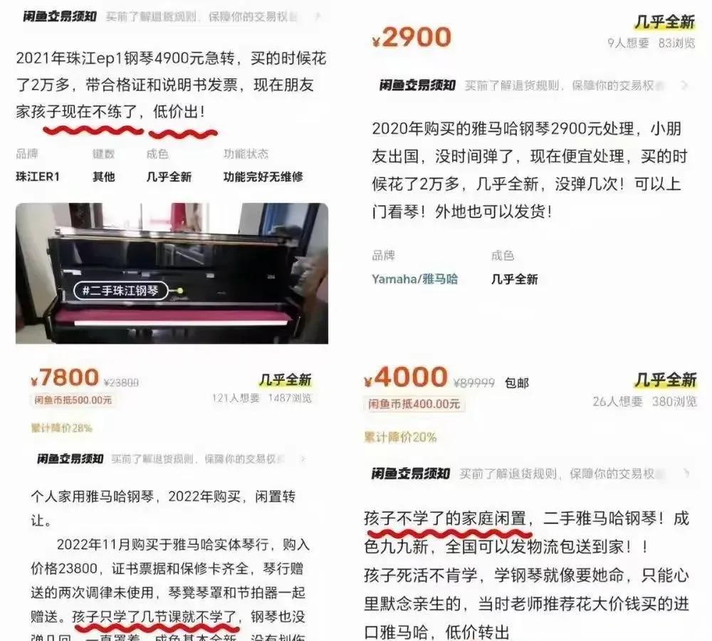 2万多买的钢琴,卖5000都没人要,曾经无数中产的“教育标配”,如今死了一大半。昔日门庭若市的钢琴门店批量关门,一个个走的无声无息。家长们花2、3万给孩子买的钢琴,也成了家里最占地方的摆设。挂出去当二手卖的,居然半年都没人带问的,价格从8000调到6000再调到4900,照样无人问津。 就是专门做钢琴生意的上市公司珠江钢琴,也是连年亏损,2019年还能卖掉39万台钢琴,2024年连10万都卖不到。去年一年超过7000家琴行悄然关门,仿佛钢琴自上到下整个产业链都没落了,除了极少数音乐学院的学子和真正爱好者外,钢琴已远离寻常中产家庭。 这一切变化如此之快,一个现实原因,就是中产家庭的钱包告急,像钢琴这种高昂的消费爱好能砍就砍了。一个是国潮乐器复兴,像琵琶、古筝等传统乐器受宠,而且花费更低,成了钢琴的平替。但最重要的,还是国内相关政策的巨变,直白的说就是中考加分制的取消,以前为了达到钢琴9级实现加10分的目的,大批家长砸锅卖铁也要支持孩子学钢琴。几年前这一艺术特长加分项取消,对钢琴行业和琴行几乎就是毁灭性打击。 结果就成了当下这一局面,曾经疯抢的钢琴,现在打骨折都没人要。这也是时代的巨变,30年河东30年河西实在太久,现在都说三年五年就得变了。